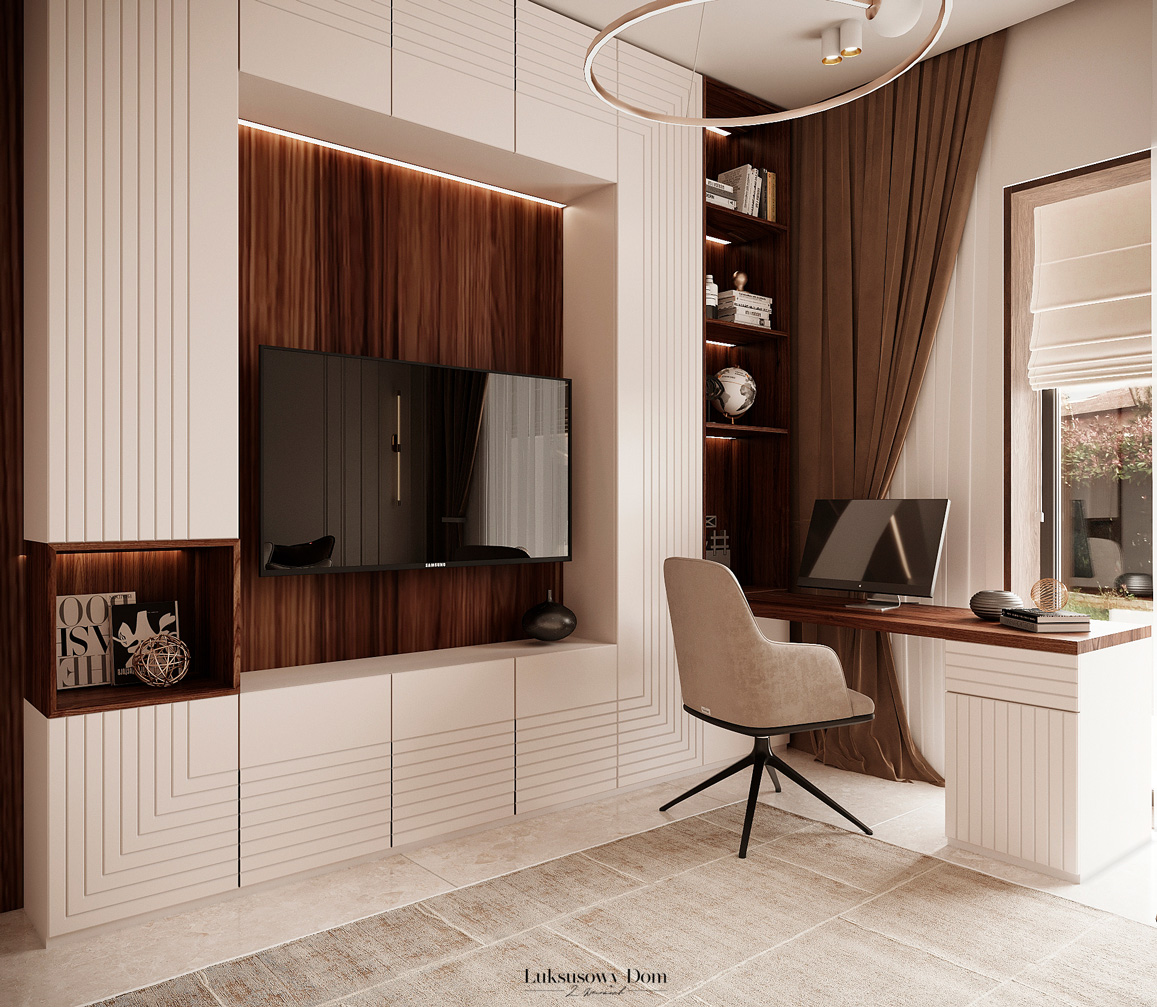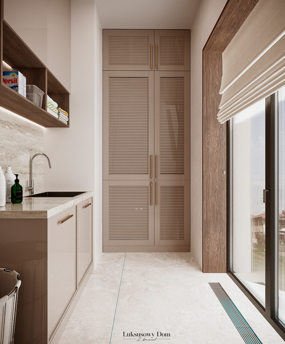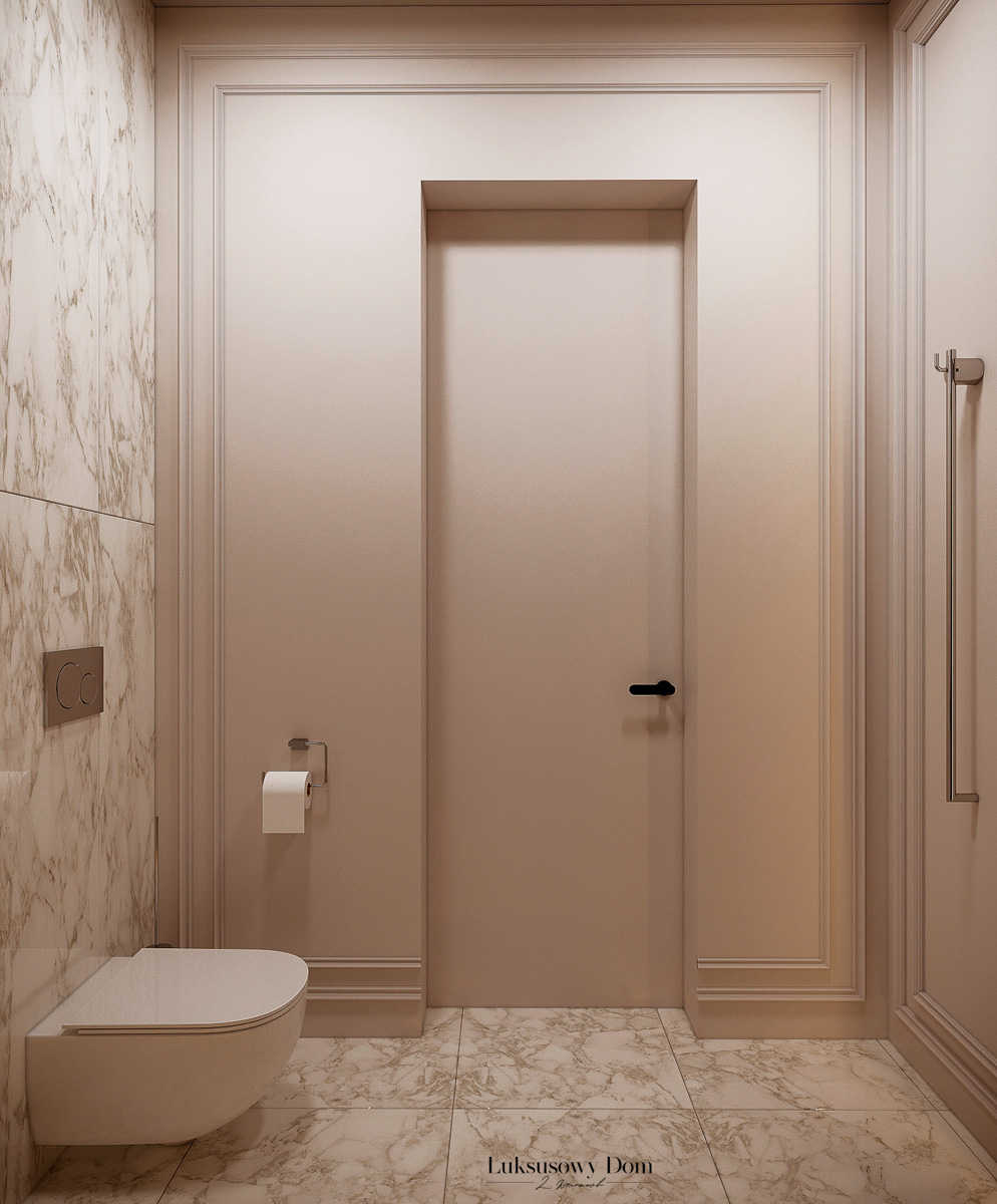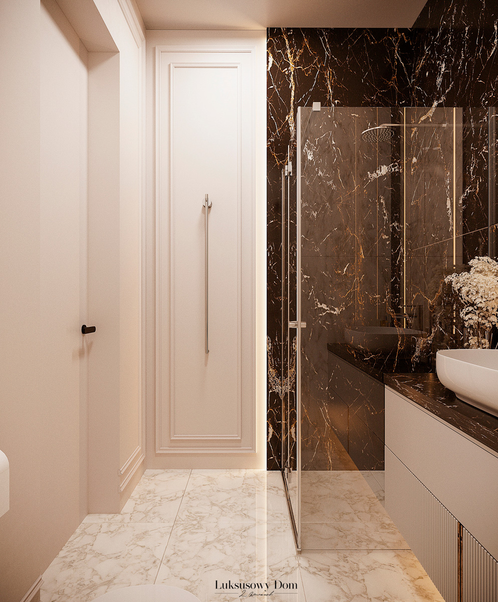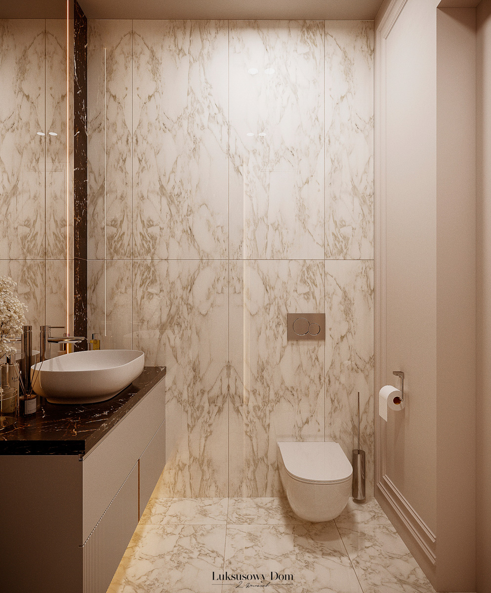 Parter tego domu jednorodzinnego zapewnia elegancką przestrzeń dla całej rodziny. Wiatrołap witający gości w jasnych tonacjach, zdobiony piękną sztukaterią. Salon, połączony z jadalnią i kuchnią, emanuje luksusem, z telewizorem na marmurowej ścianie i bio kominkiem. Duży stół w jadalni zapewnia miejsce dla ośmiu osób, a wyspa kuchenna to idealne miejsce na codzienne śniadania. W eleganckim gabinecie, w wykończeniu ciemnego drewna i jasnych kolorów, można skoncentrować się na pracy. W toalecie dominują jasne beże, zestawione z czarną płytką o ciemnej żyle, dodając elegancji i kontrastu.