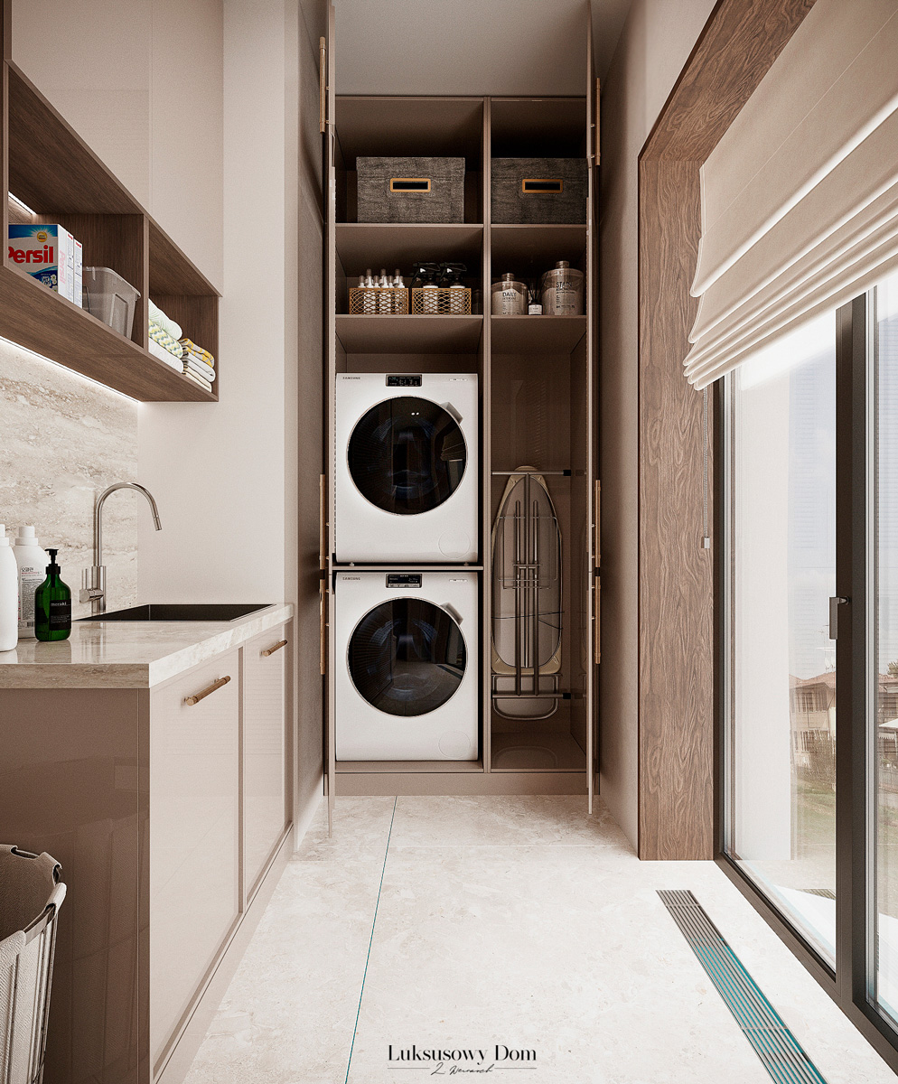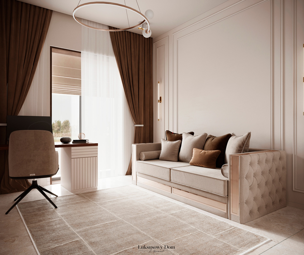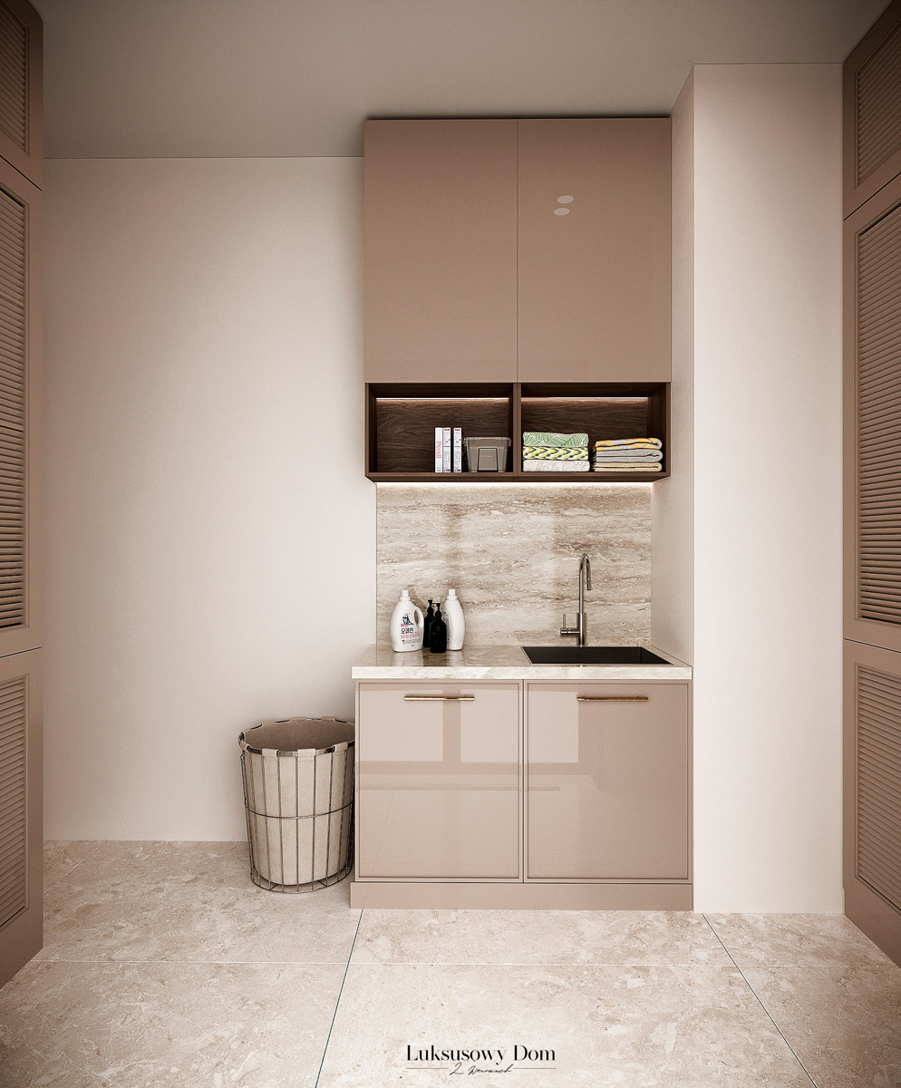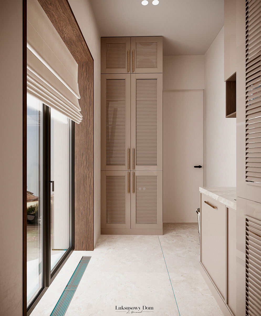 Parter tego domu jednorodzinnego zapewnia elegancką przestrzeń dla całej rodziny. Wiatrołap witający gości w jasnych tonacjach, zdobiony piękną sztukaterią. Salon, połączony z jadalnią i kuchnią, emanuje luksusem, z telewizorem na marmurowej ścianie i bio kominkiem. Duży stół w jadalni zapewnia miejsce dla ośmiu osób, a wyspa kuchenna to idealne miejsce na codzienne śniadania. W eleganckim gabinecie, w wykończeniu ciemnego drewna i jasnych kolorów, można skoncentrować się na pracy. W toalecie dominują jasne beże, zestawione z czarną płytką o ciemnej żyle, dodając elegancji i kontrastu.