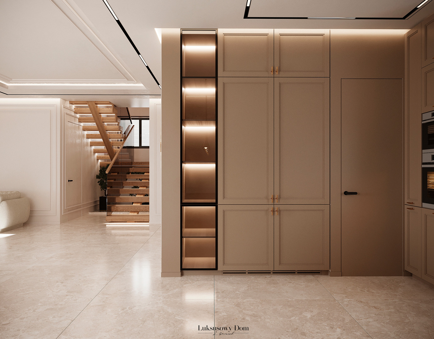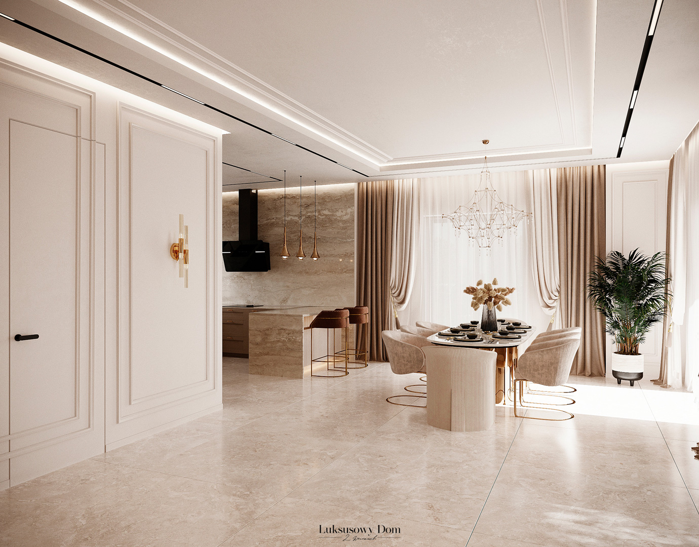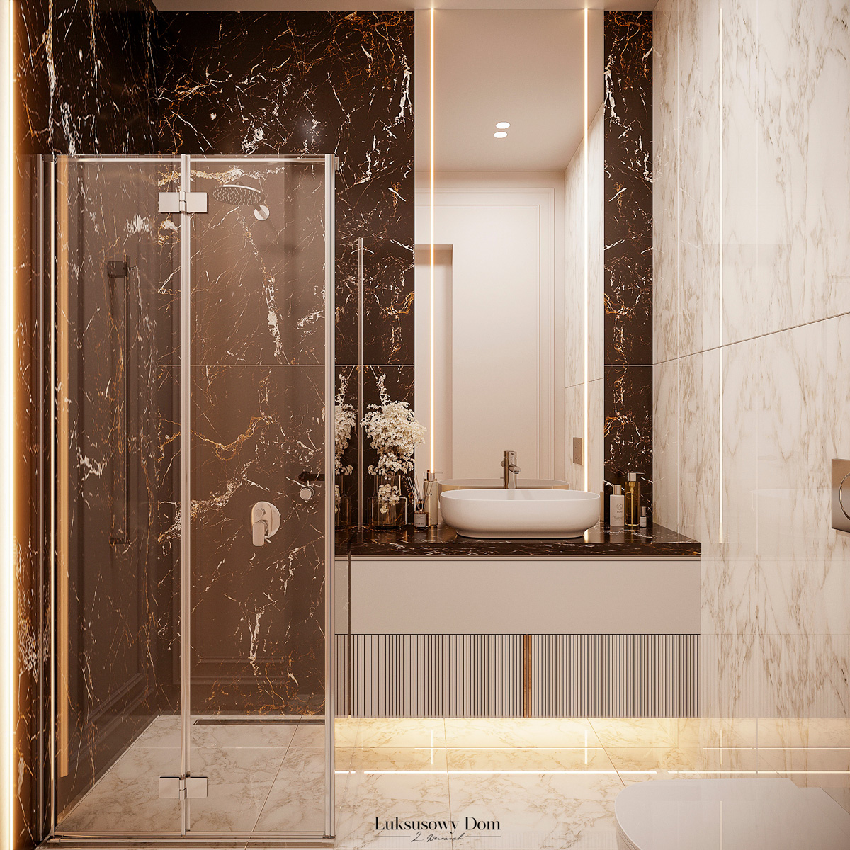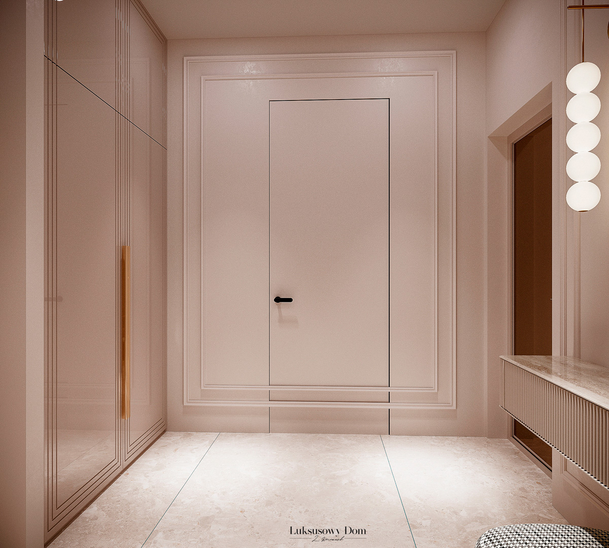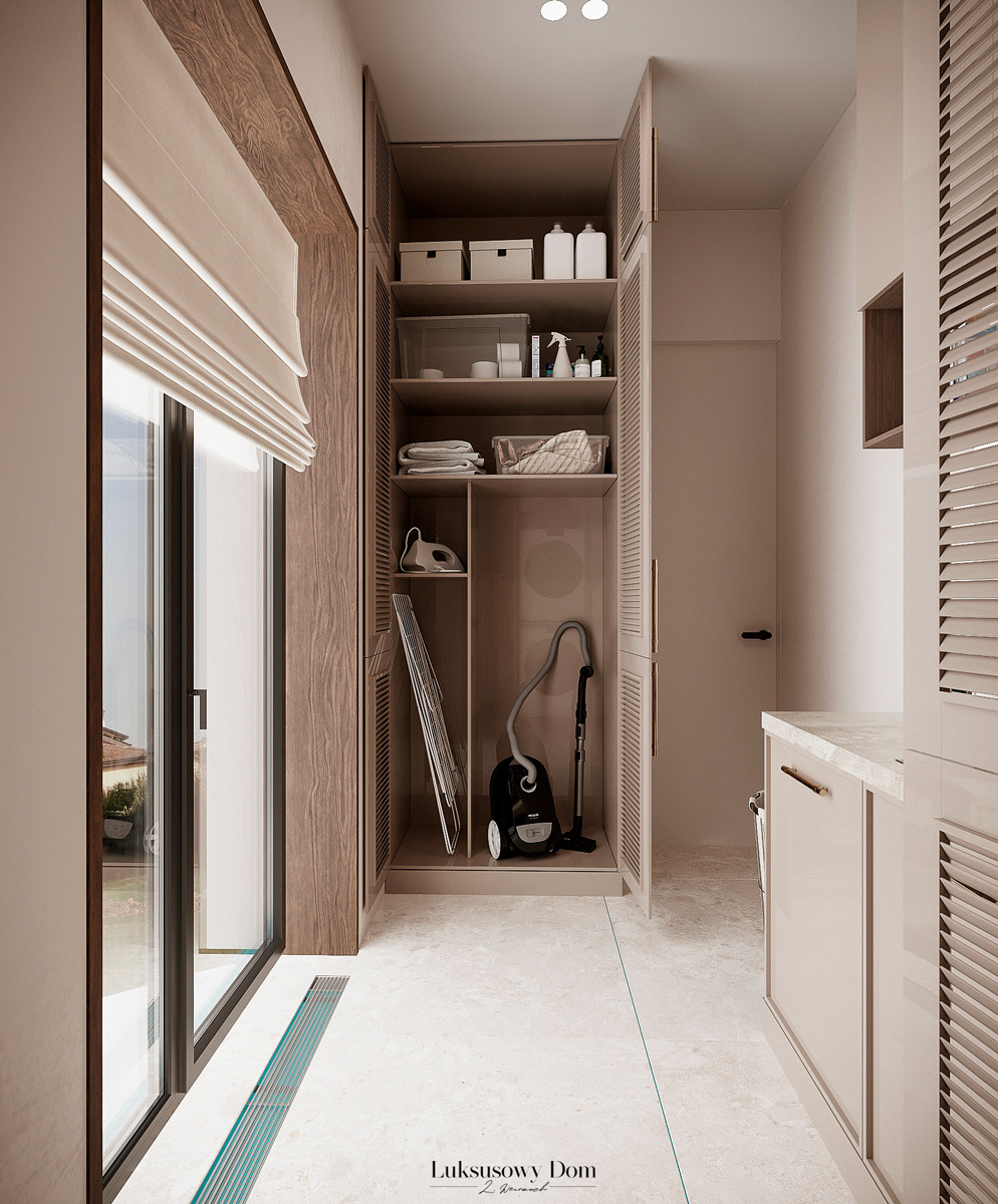 Parter tego domu jednorodzinnego zapewnia elegancką przestrzeń dla całej rodziny. Wiatrołap witający gości w jasnych tonacjach, zdobiony piękną sztukaterią. Salon, połączony z jadalnią i kuchnią, emanuje luksusem, z telewizorem na marmurowej ścianie i bio kominkiem. Duży stół w jadalni zapewnia miejsce dla ośmiu osób, a wyspa kuchenna to idealne miejsce na codzienne śniadania. W eleganckim gabinecie, w wykończeniu ciemnego drewna i jasnych kolorów, można skoncentrować się na pracy. W toalecie dominują jasne beże, zestawione z czarną płytką o ciemnej żyle, dodając elegancji i kontrastu.