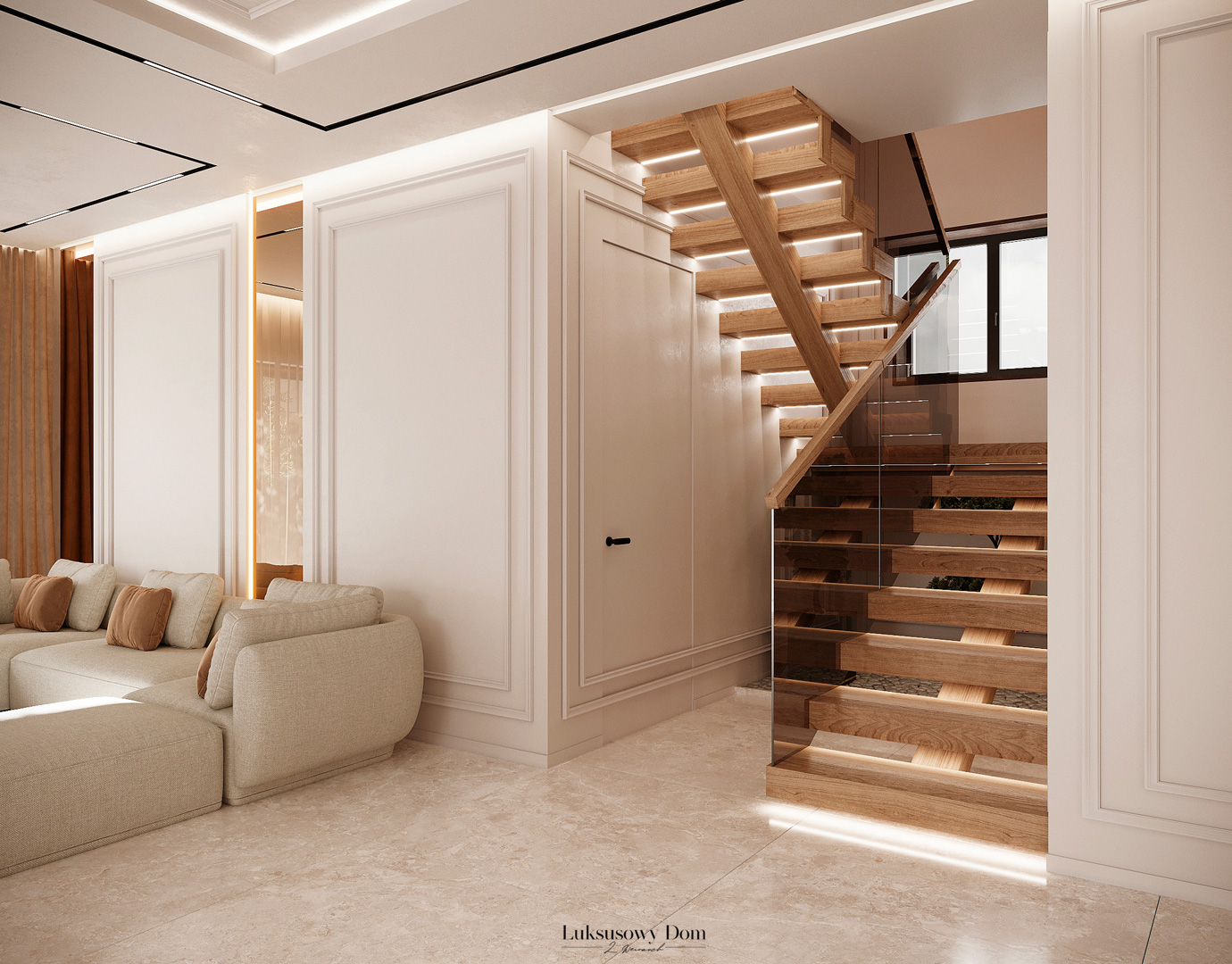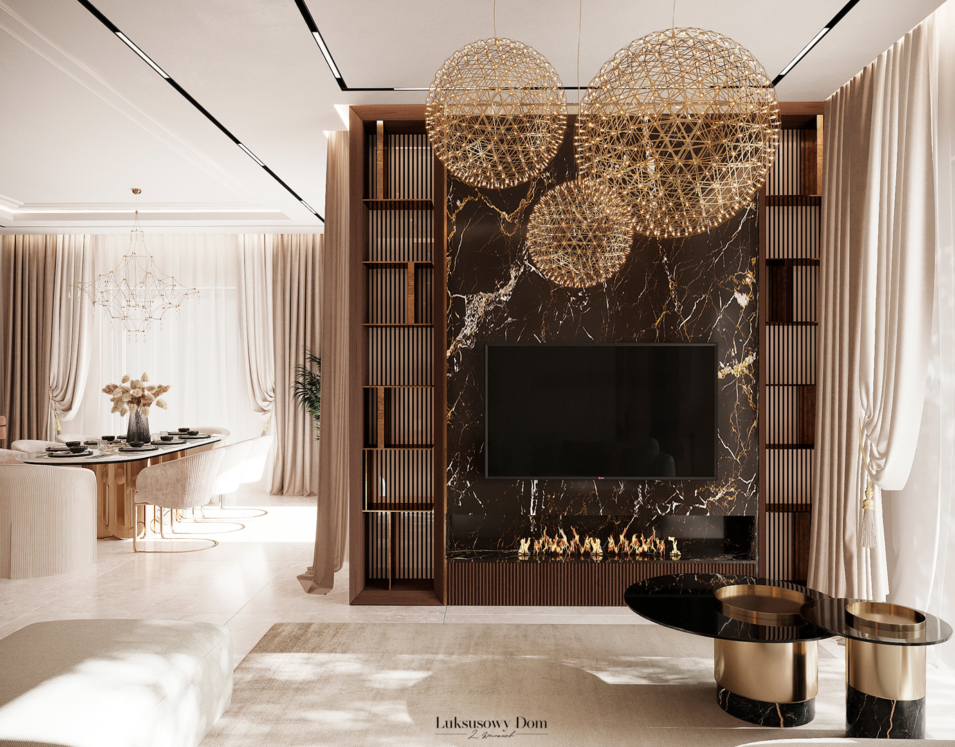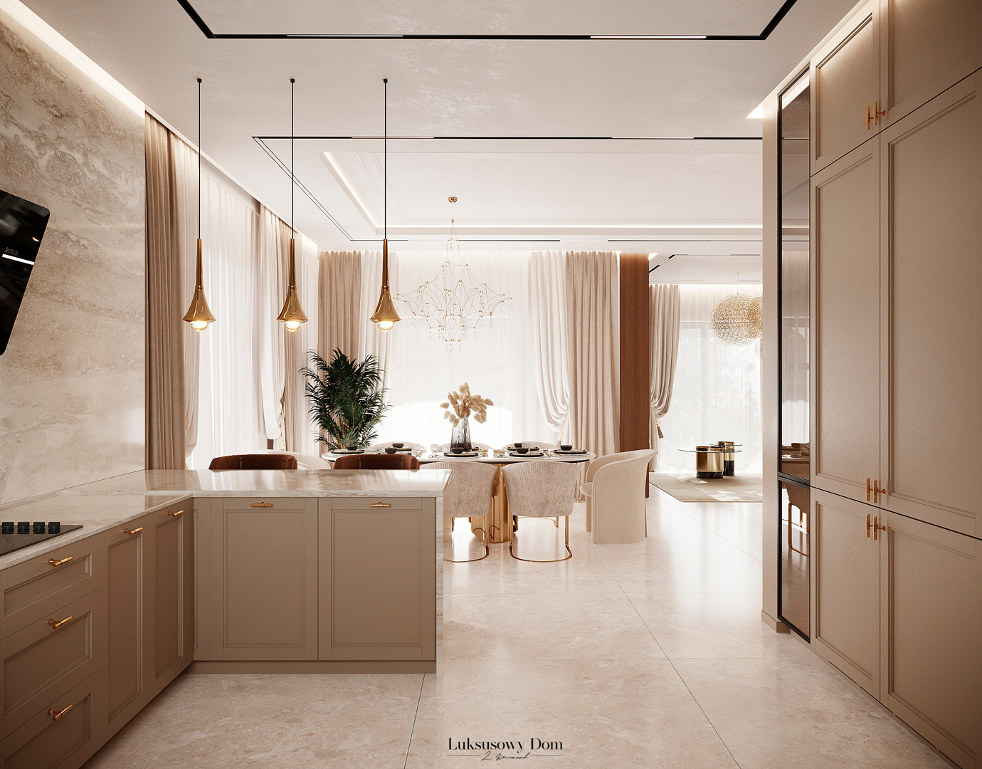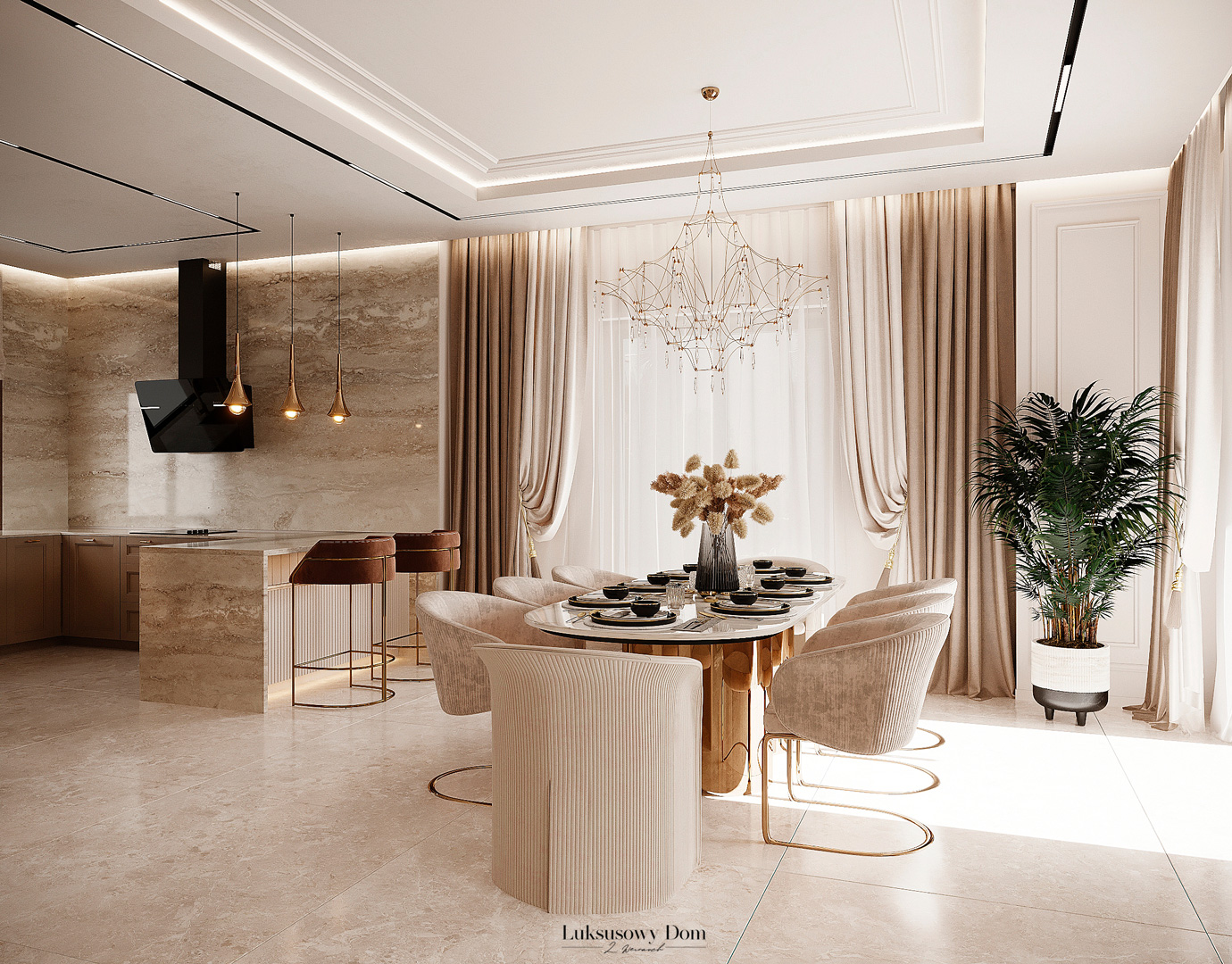 Parter tego domu jednorodzinnego zapewnia elegancką przestrzeń dla całej rodziny. Wiatrołap witający gości w jasnych tonacjach, zdobiony piękną sztukaterią. Salon, połączony z jadalnią i kuchnią, emanuje luksusem, z telewizorem na marmurowej ścianie i bio kominkiem. Duży stół w jadalni zapewnia miejsce dla ośmiu osób, a wyspa kuchenna to idealne miejsce na codzienne śniadania. W eleganckim gabinecie, w wykończeniu ciemnego drewna i jasnych kolorów, można skoncentrować się na pracy. W toalecie dominują jasne beże, zestawione z czarną płytką o ciemnej żyle, dodając elegancji i kontrastu.