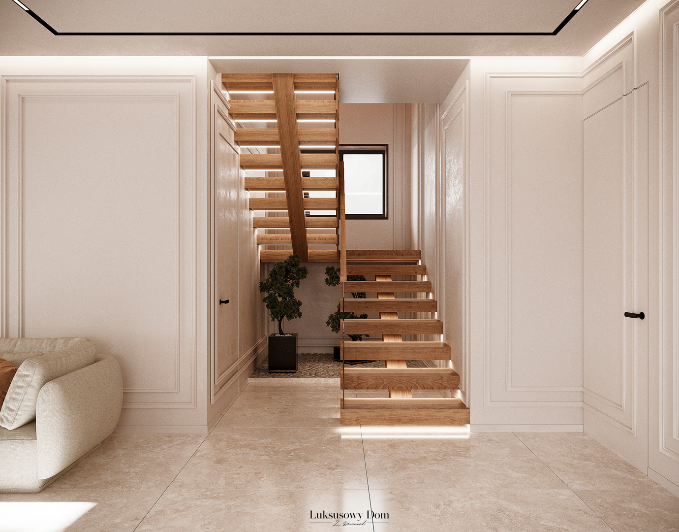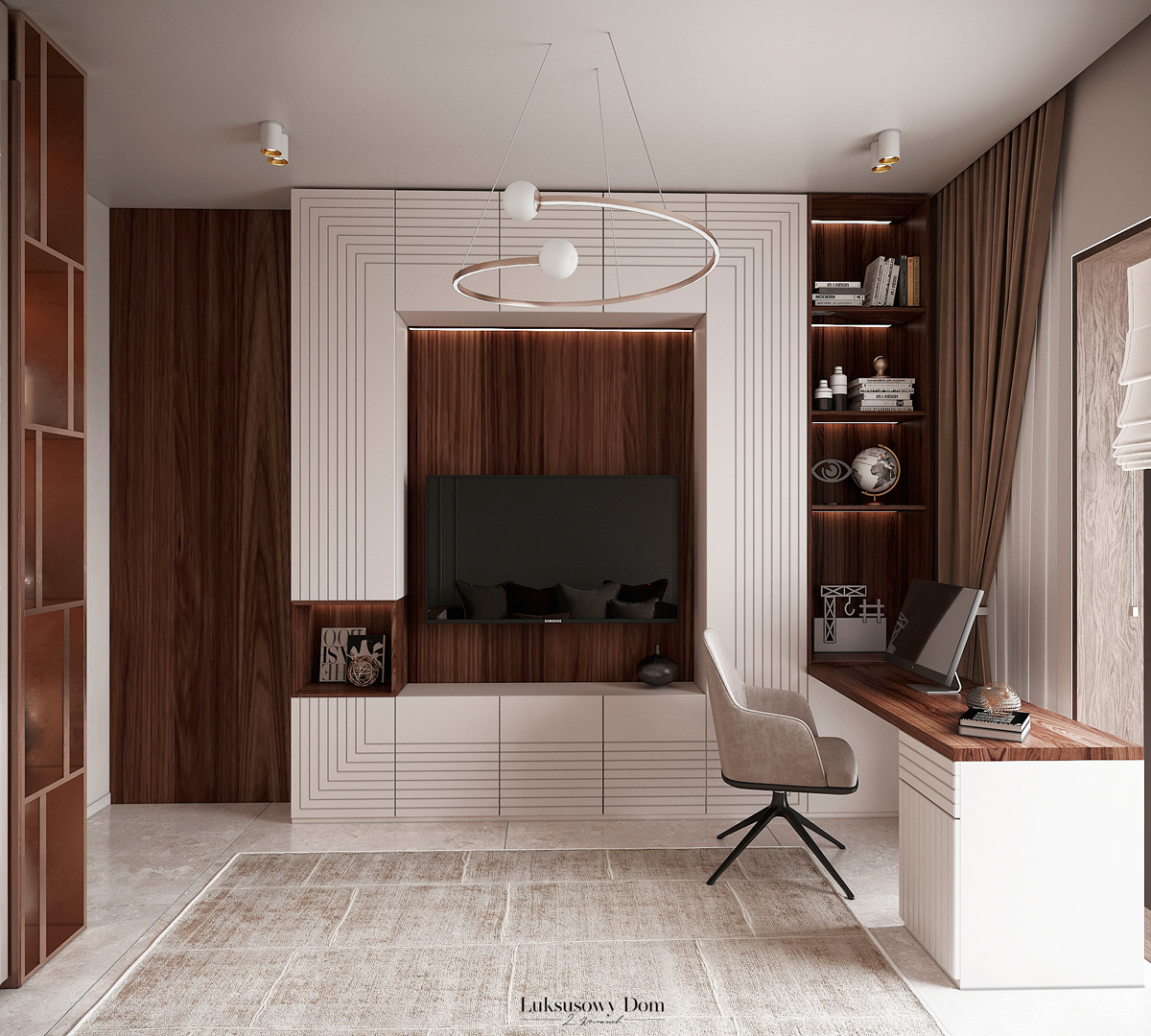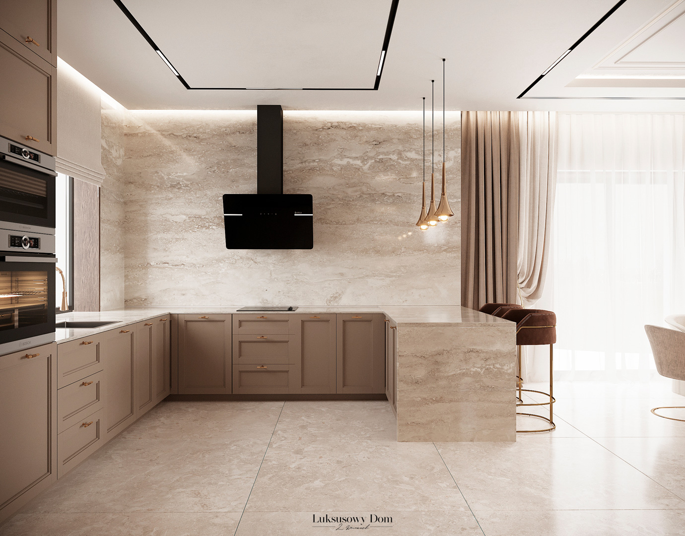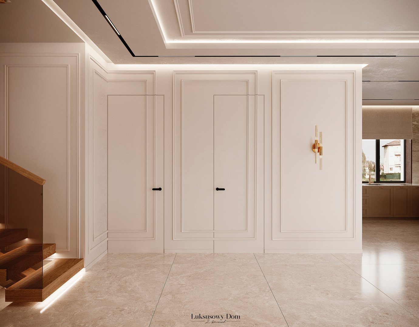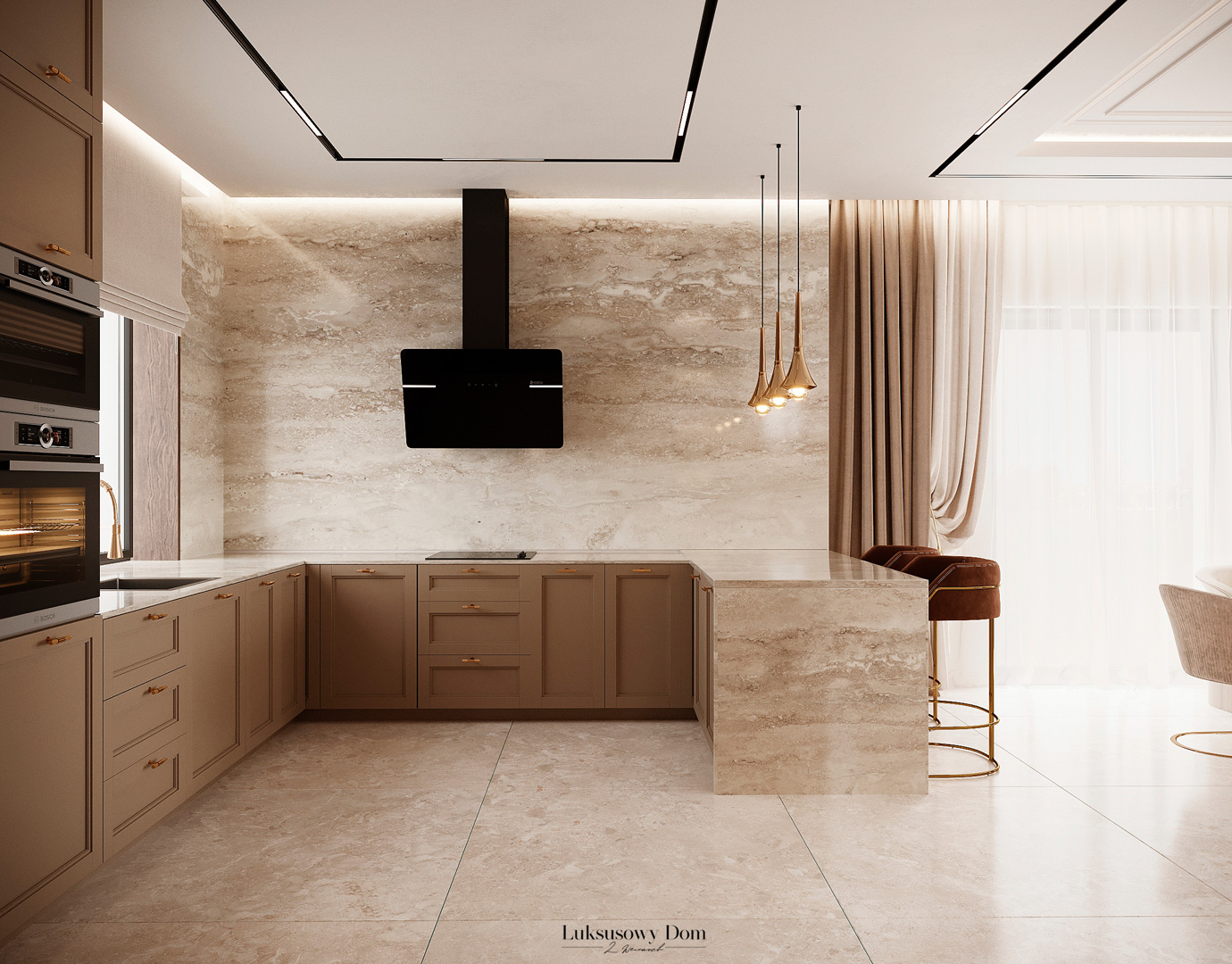 Parter tego domu jednorodzinnego zapewnia elegancką przestrzeń dla całej rodziny. Wiatrołap witający gości w jasnych tonacjach, zdobiony piękną sztukaterią. Salon, połączony z jadalnią i kuchnią, emanuje luksusem, z telewizorem na marmurowej ścianie i bio kominkiem. Duży stół w jadalni zapewnia miejsce dla ośmiu osób, a wyspa kuchenna to idealne miejsce na codzienne śniadania. W eleganckim gabinecie, w wykończeniu ciemnego drewna i jasnych kolorów, można skoncentrować się na pracy. W toalecie dominują jasne beże, zestawione z czarną płytką o ciemnej żyle, dodając elegancji i kontrastu.