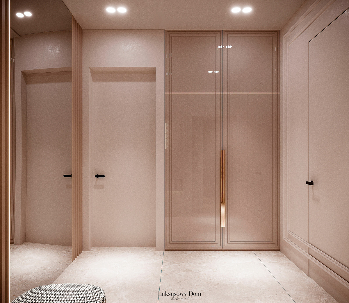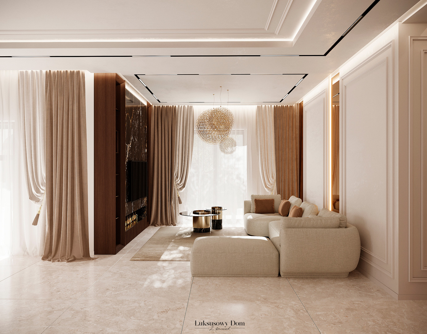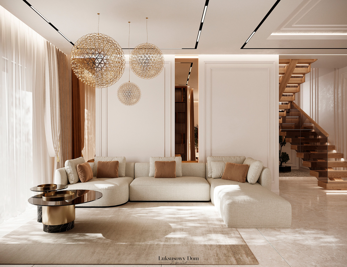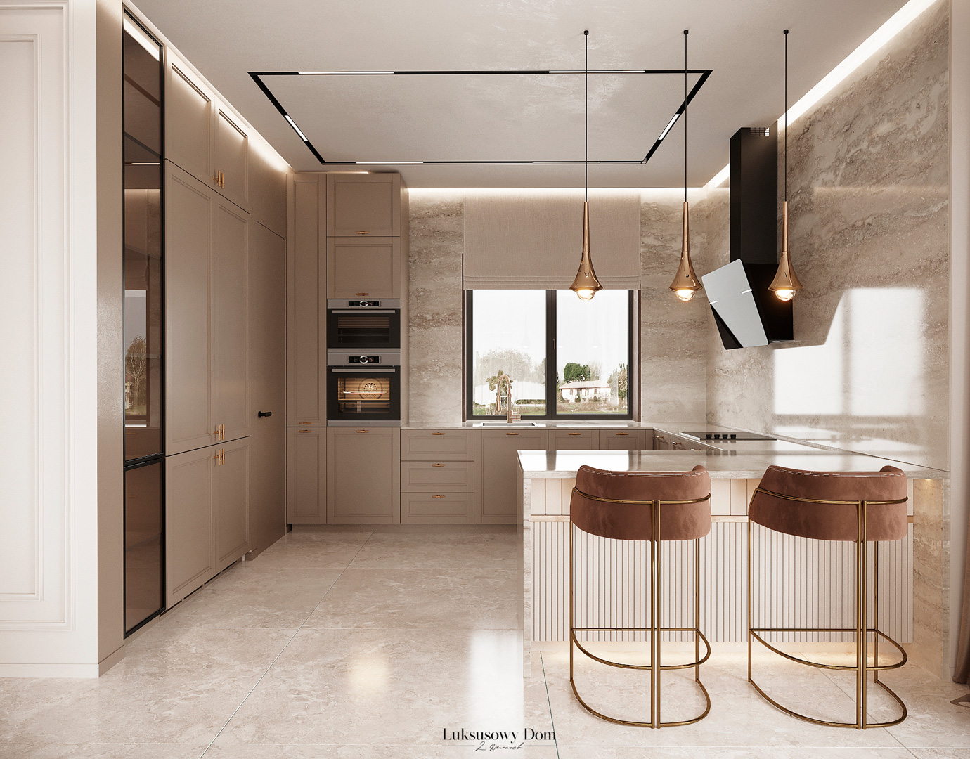 Parter tego domu jednorodzinnego zapewnia elegancką przestrzeń dla całej rodziny. Wiatrołap witający gości w jasnych tonacjach, zdobiony piękną sztukaterią. Salon, połączony z jadalnią i kuchnią, emanuje luksusem, z telewizorem na marmurowej ścianie i bio kominkiem. Duży stół w jadalni zapewnia miejsce dla ośmiu osób, a wyspa kuchenna to idealne miejsce na codzienne śniadania. W eleganckim gabinecie, w wykończeniu ciemnego drewna i jasnych kolorów, można skoncentrować się na pracy. W toalecie dominują jasne beże, zestawione z czarną płytką o ciemnej żyle, dodając elegancji i kontrastu.