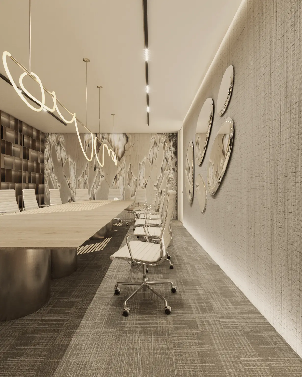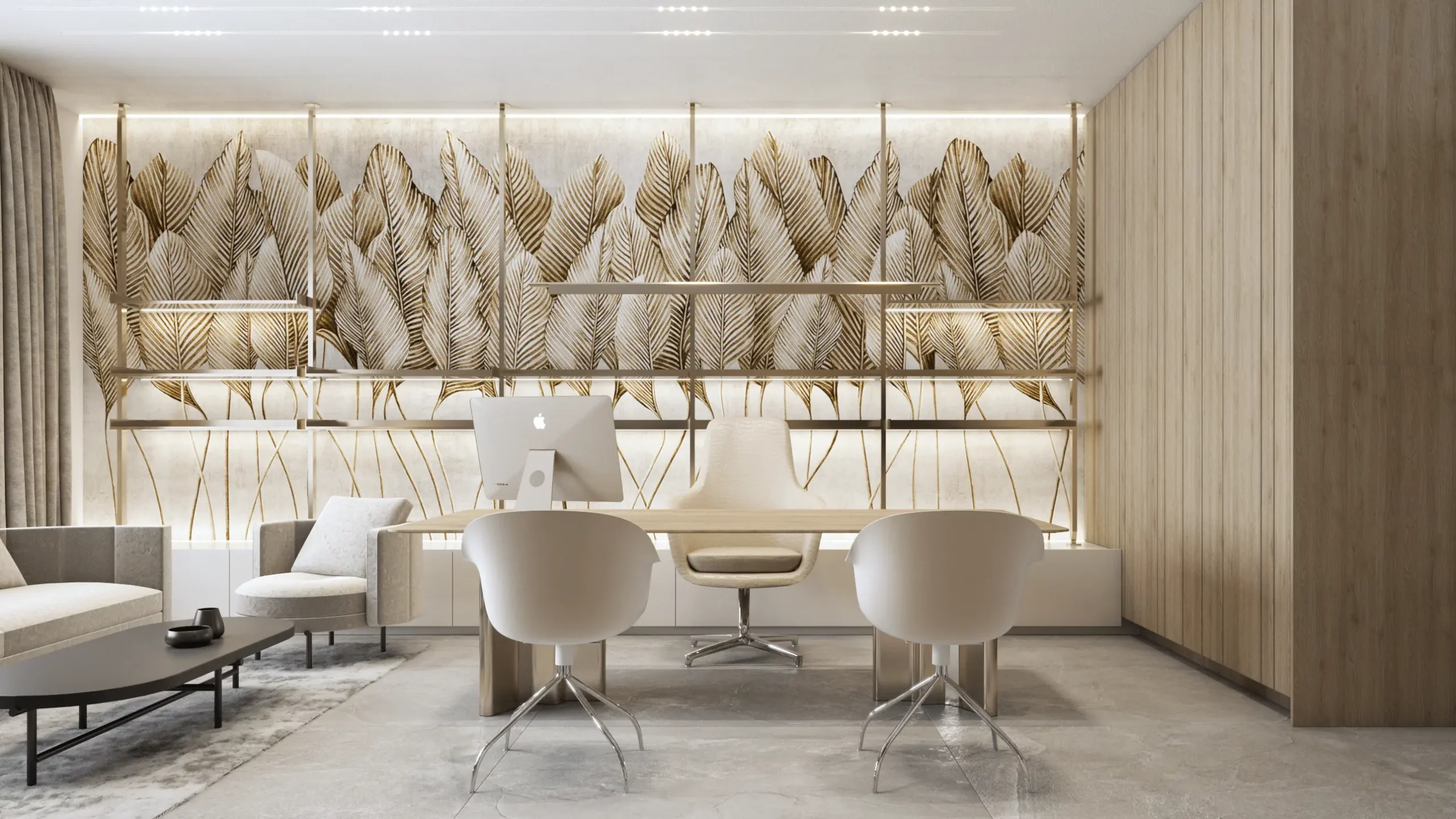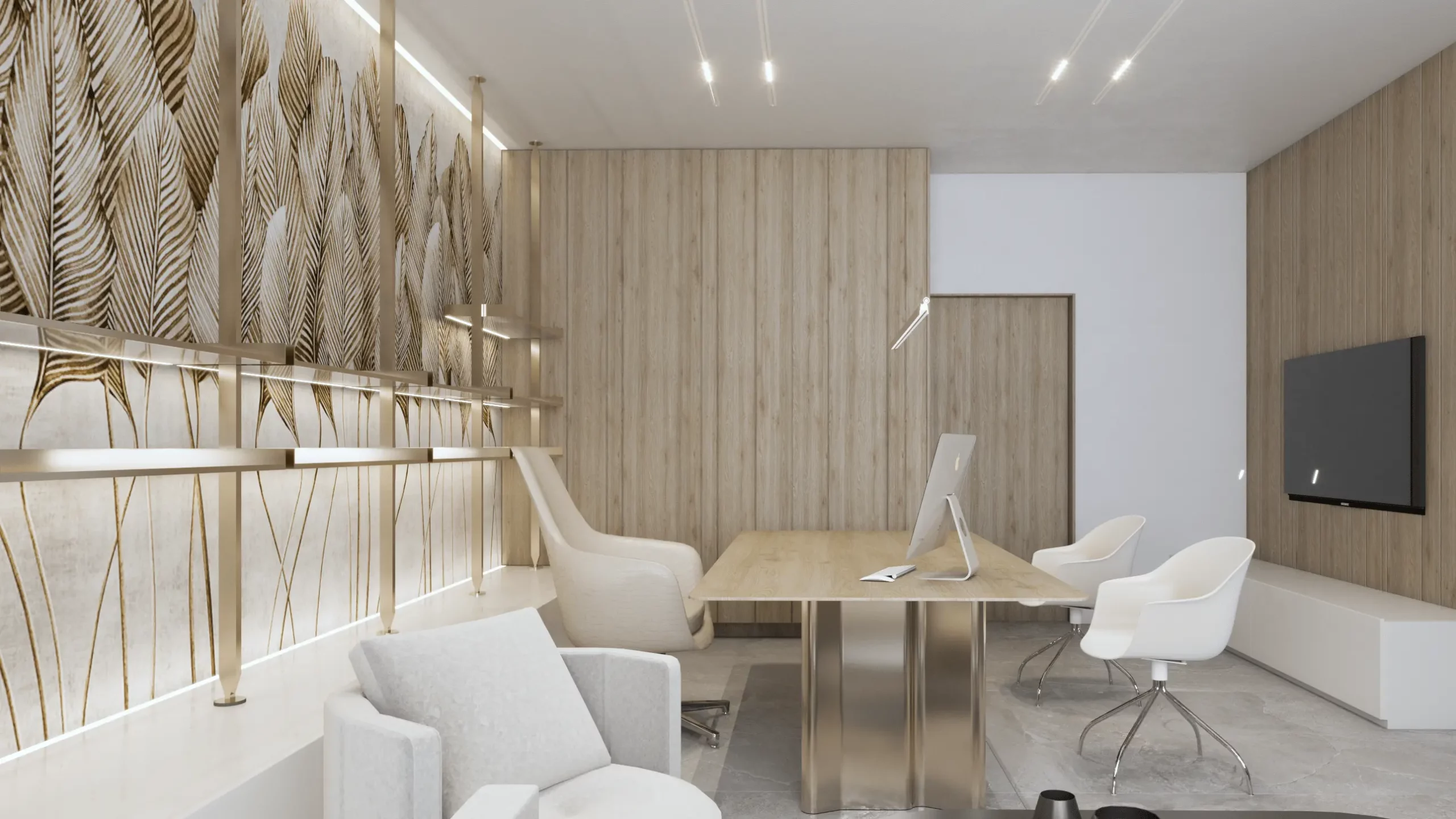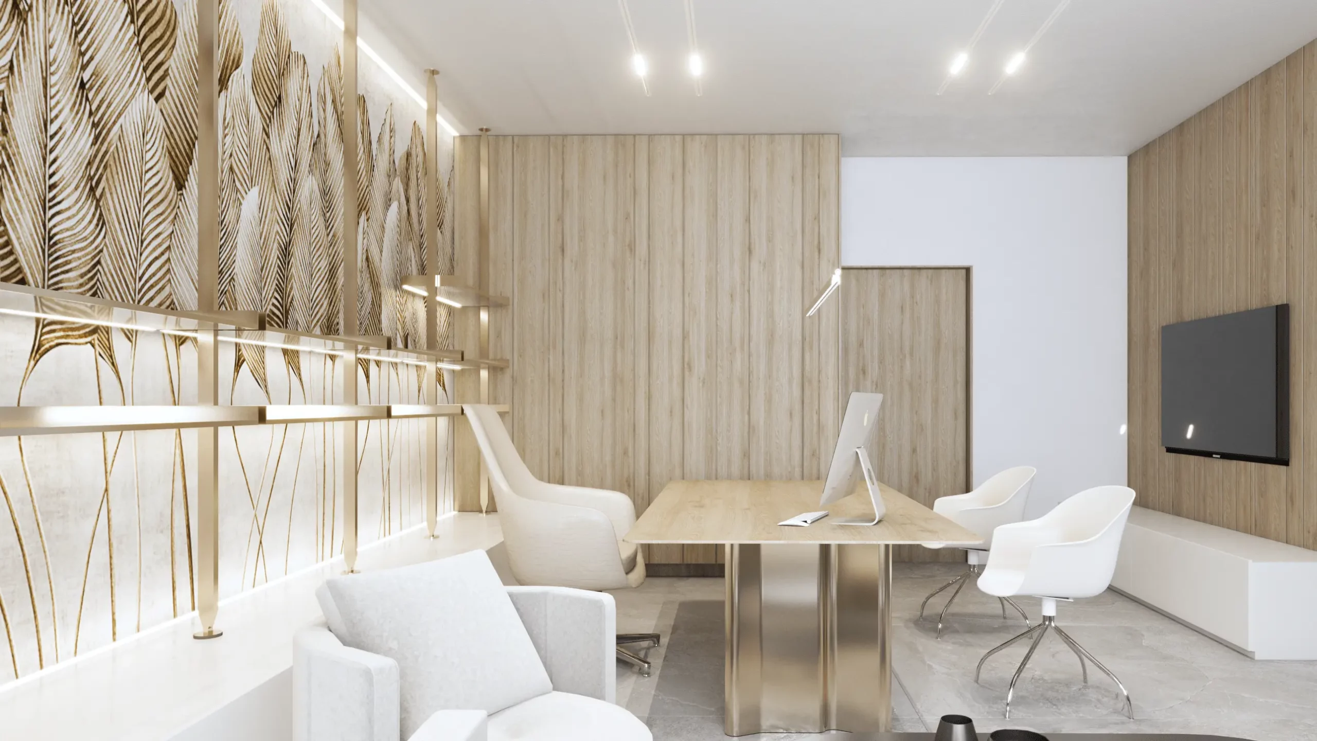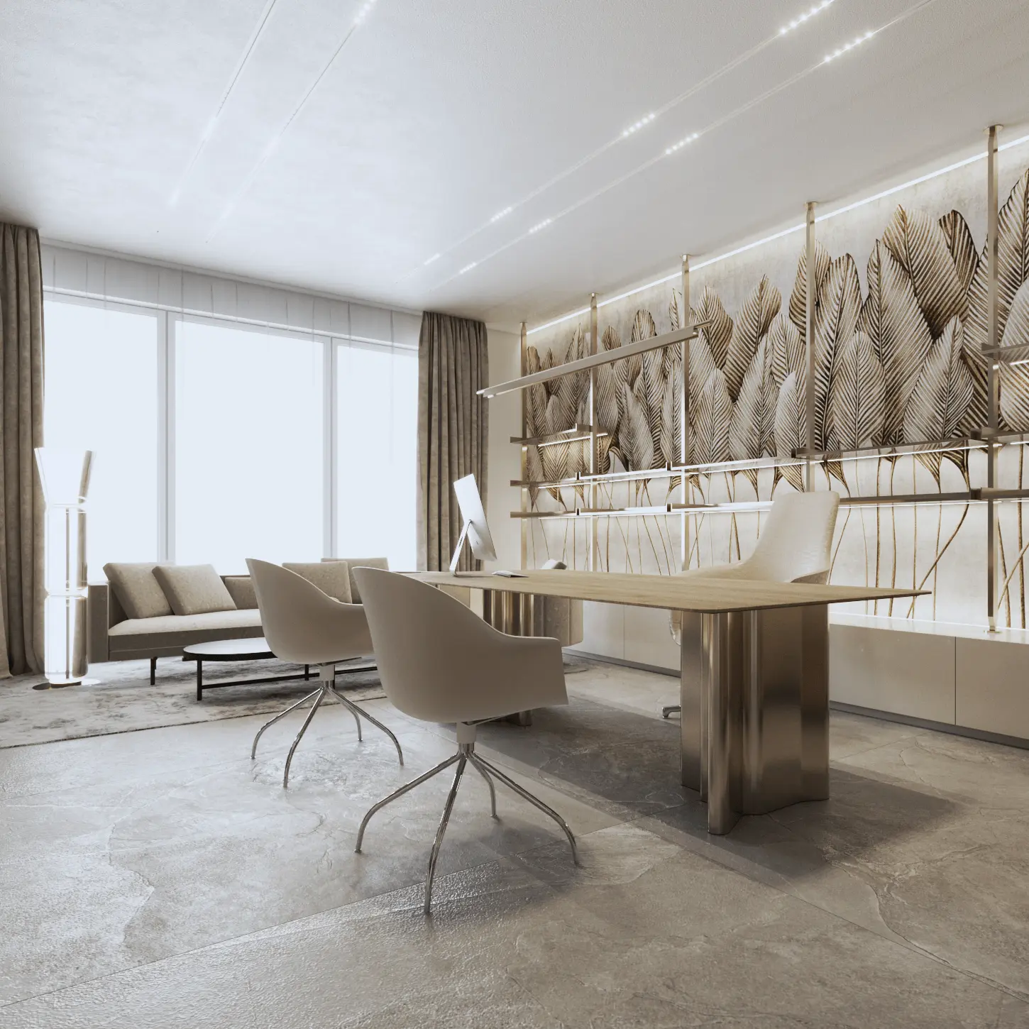 Koncepcja wnętrz dla firmy zajmującej się uprawą owoców i warzyw to zbiór kilku odważnych wersji projektów, które łączą w sobie naturalne faktury drewna i marmurów o różnych użyleniach. Dominują designerskie włoskie meble, tworzące unikalny i ekskluzywny charakter przestrzeni. Gabinet Pani Prezes to oaza spokoju, gdzie panuje harmonia drewna i delikatnych pastelowych kolorów. Natomiast gabinet Pana Prezesa charakteryzuje się ciemnymi kolorami orzechu oraz stonowanymi brązami, uzupełnionymi o ciemny sufit, nadając pomieszczeniu eleganckiego i poważnego charakteru. Korytarze i recepcja zaprojektowane zostały w drewnie i jasnym marmurze, zestawione z tapetami o botanicznych wzorach, które nadają wnętrzom świeżości i naturalnego uroku. Niezwykły klimat sali konferencyjnej tworzą welurowe zasłony w głębokim odcieniu bordo oraz lampa ledowa o nieregularnym kształcie, tworząc przestrzeń sprzyjającą inspiracji i produktywnej dyskusji.