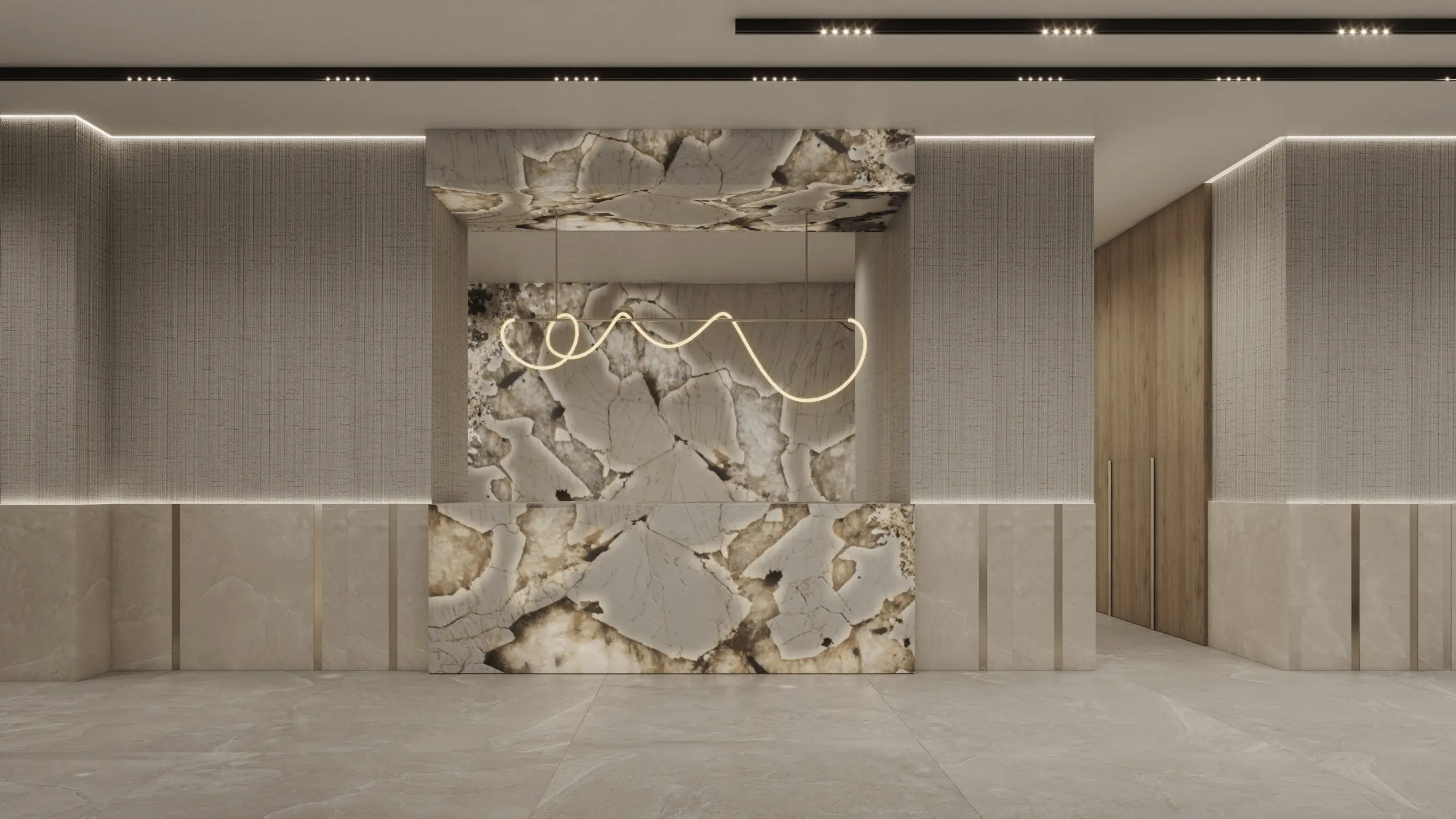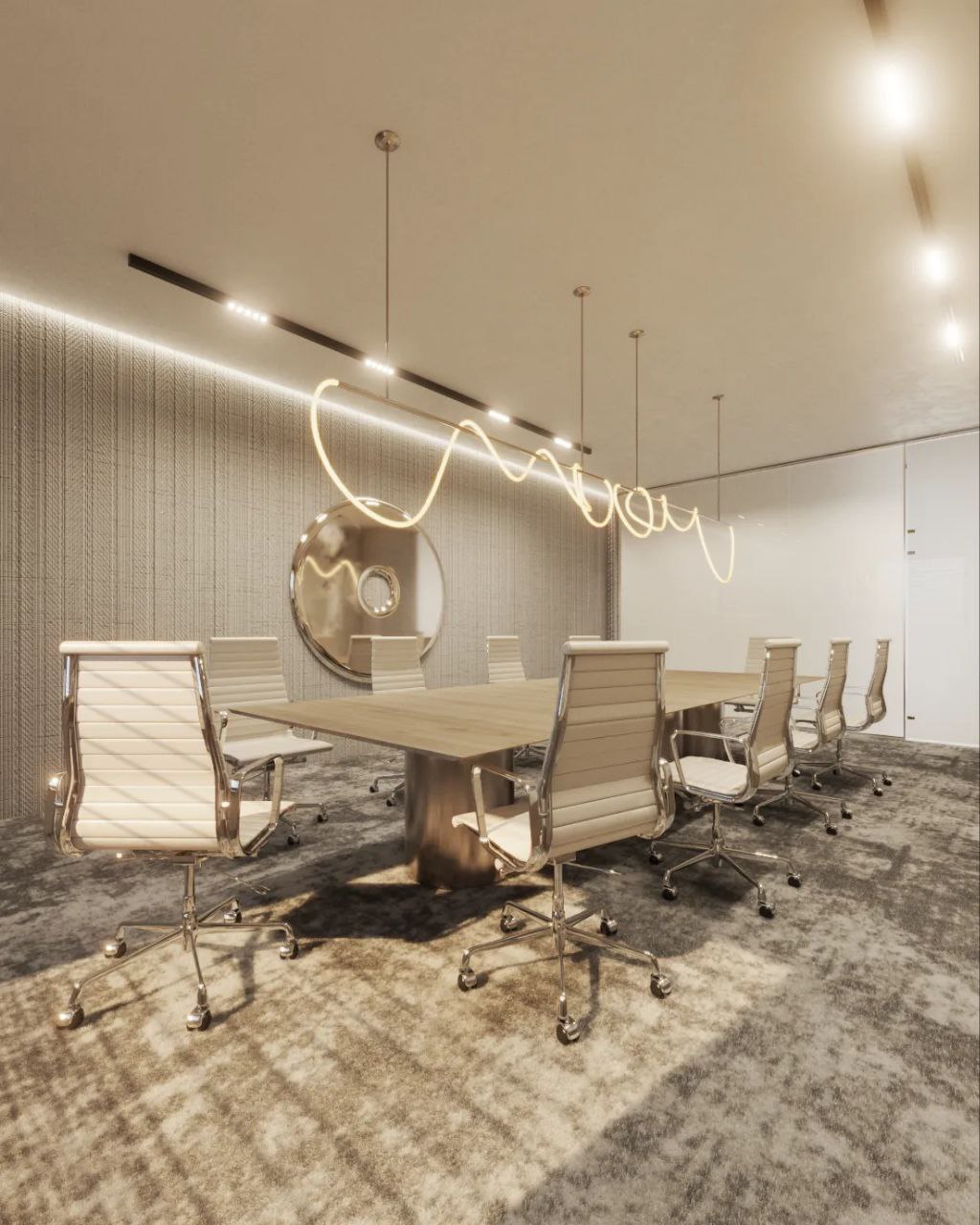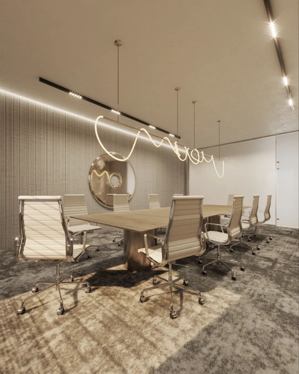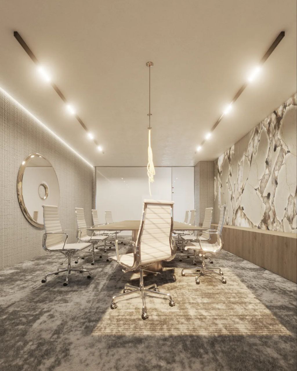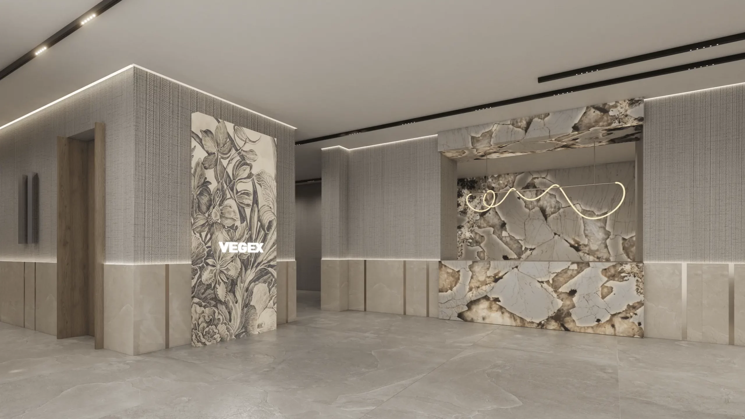 Koncepcja wnętrz dla firmy zajmującej się uprawą owoców i warzyw to zbiór kilku odważnych wersji projektów, które łączą w sobie naturalne faktury drewna i marmurów o różnych użyleniach. Dominują designerskie włoskie meble, tworzące unikalny i ekskluzywny charakter przestrzeni. Gabinet Pani Prezes to oaza spokoju, gdzie panuje harmonia drewna i delikatnych pastelowych kolorów. Natomiast gabinet Pana Prezesa charakteryzuje się ciemnymi kolorami orzechu oraz stonowanymi brązami, uzupełnionymi o ciemny sufit, nadając pomieszczeniu eleganckiego i poważnego charakteru. Korytarze i recepcja zaprojektowane zostały w drewnie i jasnym marmurze, zestawione z tapetami o botanicznych wzorach, które nadają wnętrzom świeżości i naturalnego uroku. Niezwykły klimat sali konferencyjnej tworzą welurowe zasłony w głębokim odcieniu bordo oraz lampa ledowa o nieregularnym kształcie, tworząc przestrzeń sprzyjającą inspiracji i produktywnej dyskusji.