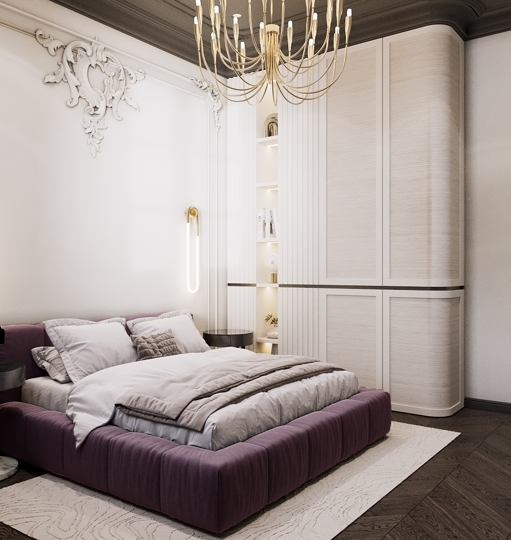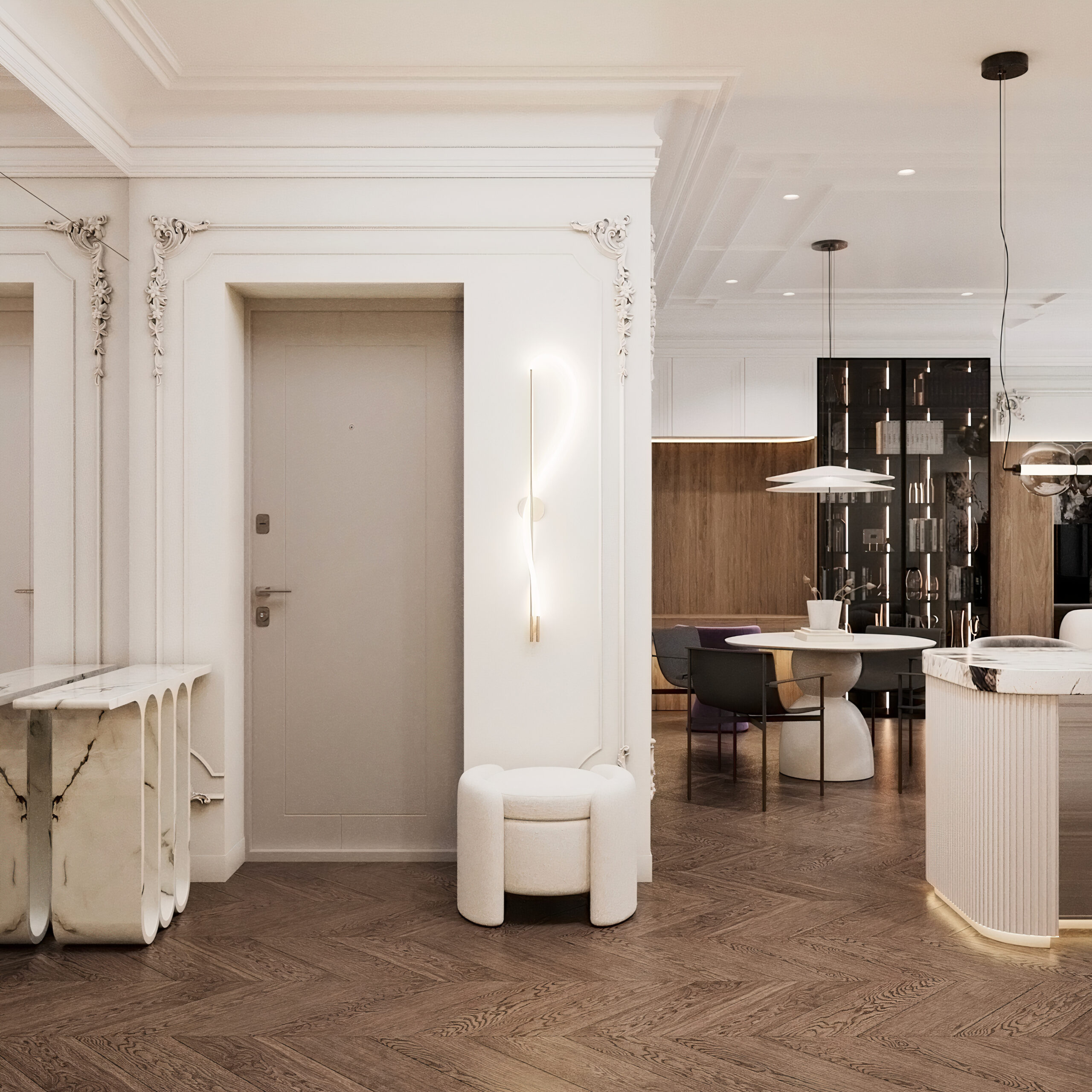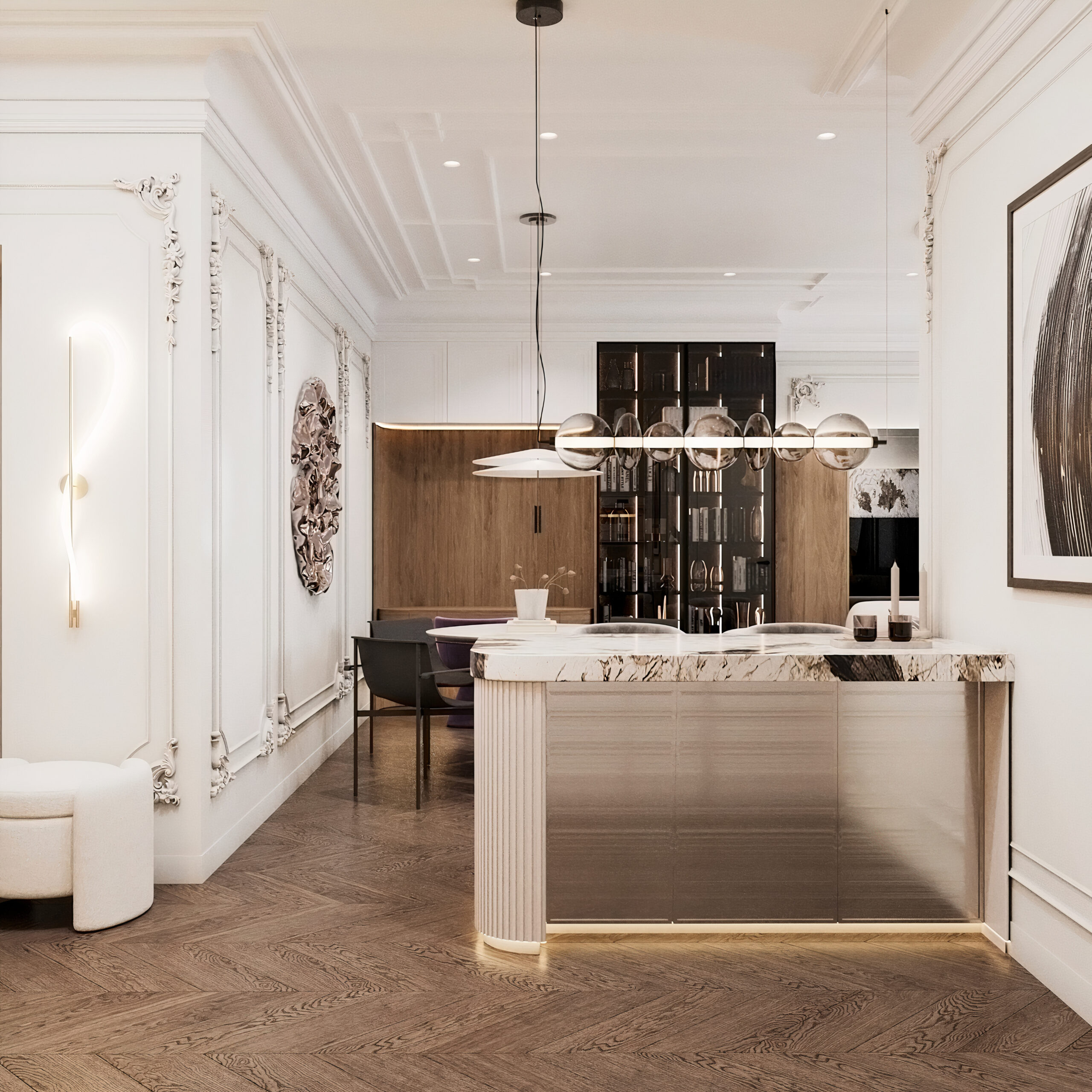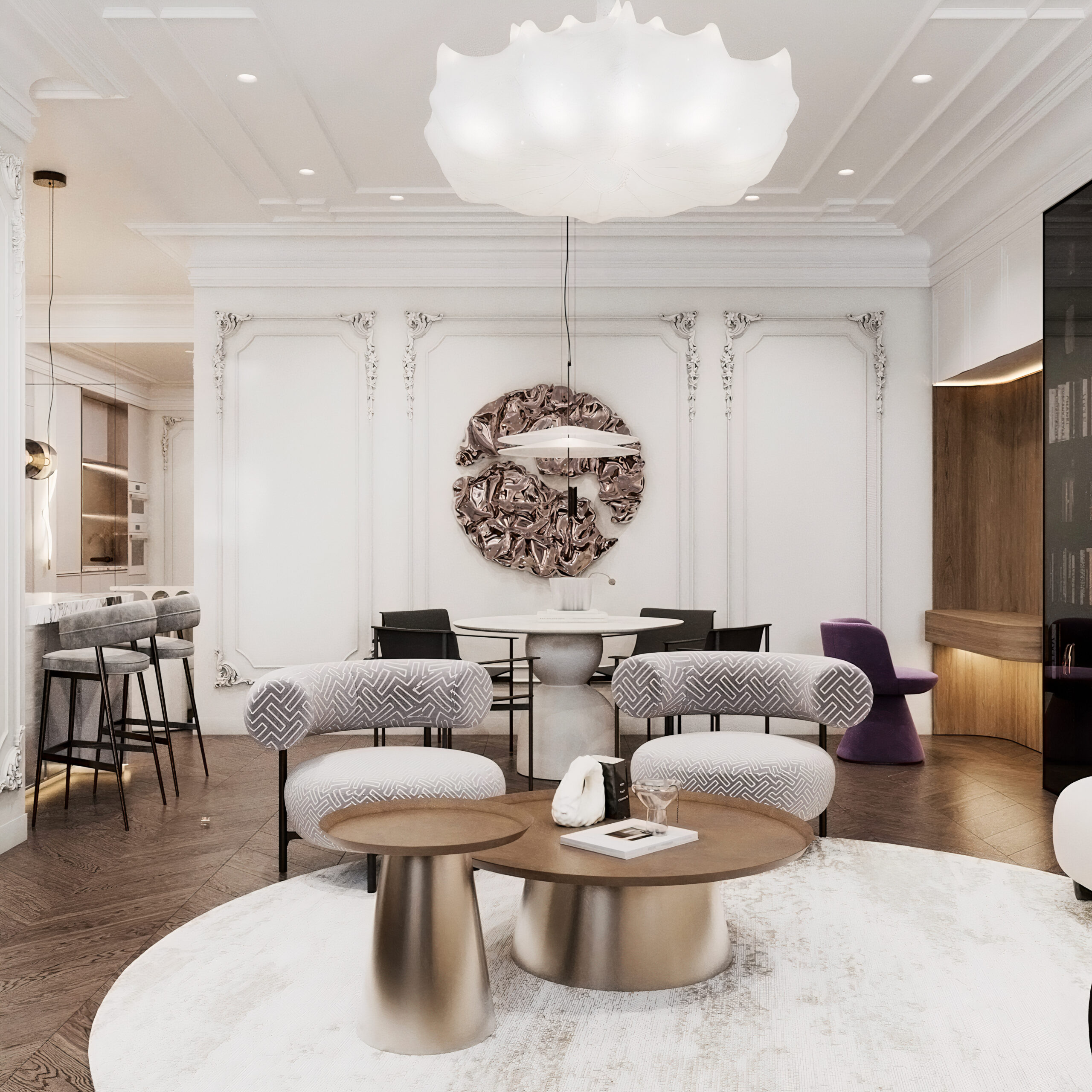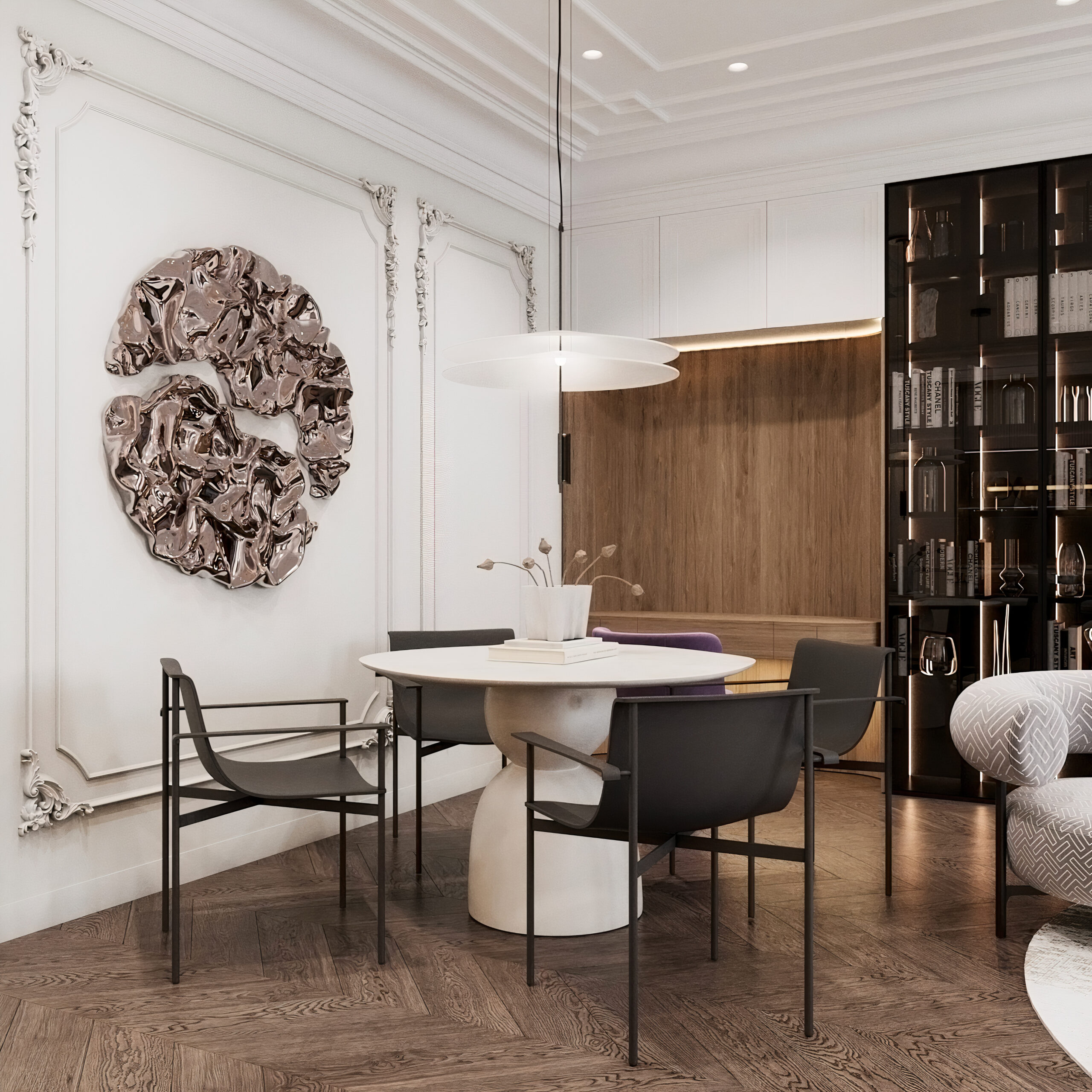Mieszkanie w kamienicy w sercu Warszawy to połączenie ponadczasowej elegancji i nowoczesnych rozwiązań. Dominująca biel w zestawieniu z podłogą w klasyczną jodełkę w głębokim odcieniu brązu tworzy szykowne, a zarazem ciepłe wnętrze. Jasne drewno na okładzinach ściennych i dekoracyjna sztukateria ścienna oraz sufitowa podkreślają charakter miejsca. Przestrzeń wypełniają designerskie meble o nietypowych kształtach oraz ściana TV wykończona naturalnym kamieniem Patagonia, uzupełniona o czarne, eleganckie dodatki. Jasna kuchnia z frezowanymi frontami, zaobloną wyspą i lustrzanymi detalami wnosi lekkość i blask. W sypialni króluje głęboka szarość, przełamana ozdobną sztukaterią i szafą z ażurowymi frontami, które dodają wnętrzu subtelności. Odważnym akcentem mieszkania jest łazienka – zestawienie głębokiego fioletu na ścianach z kamieniem Patagonia i elementami szczotkowanego złota tworzy przestrzeń pełną wyrafinowania i wyjątkowego charakteru.