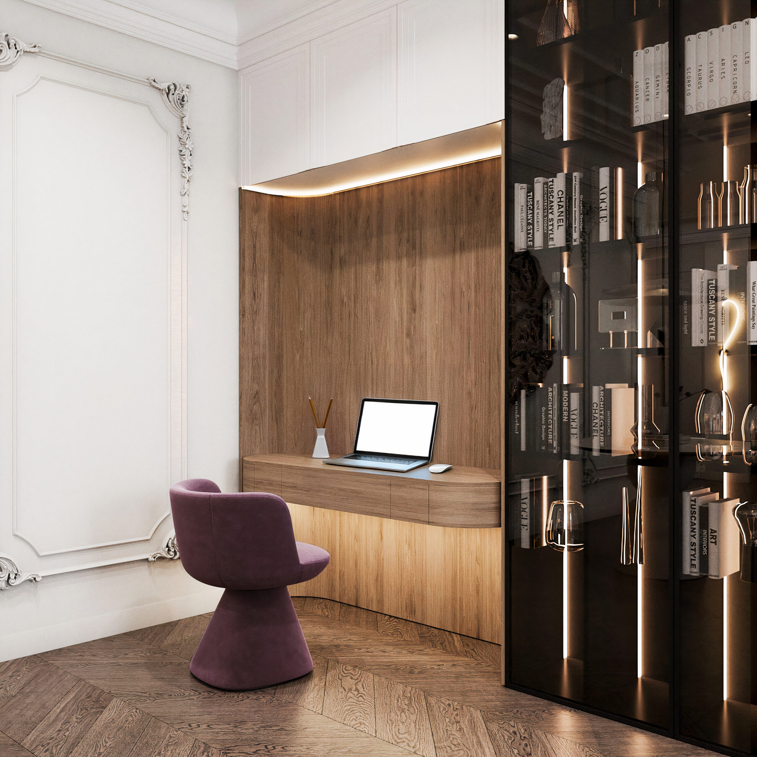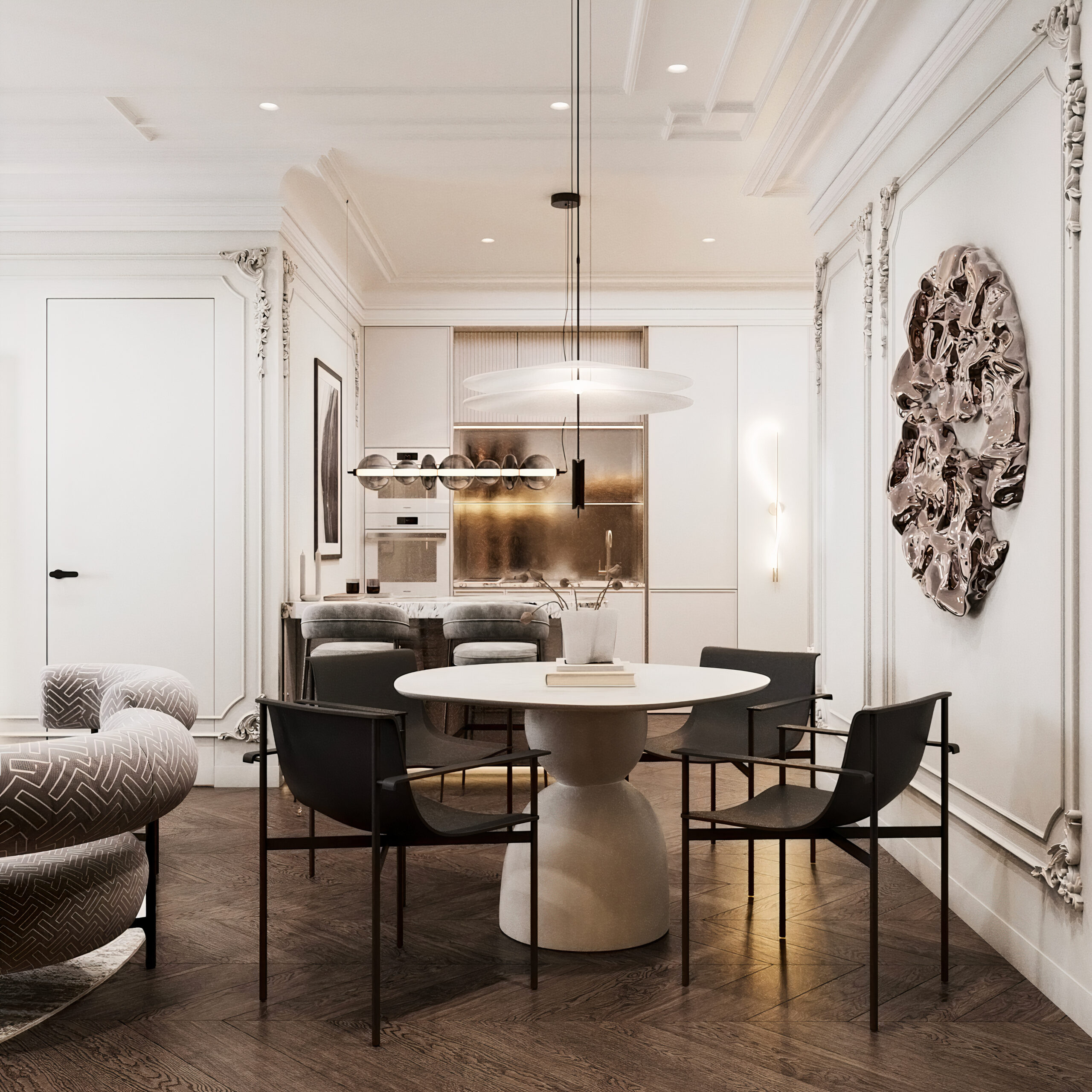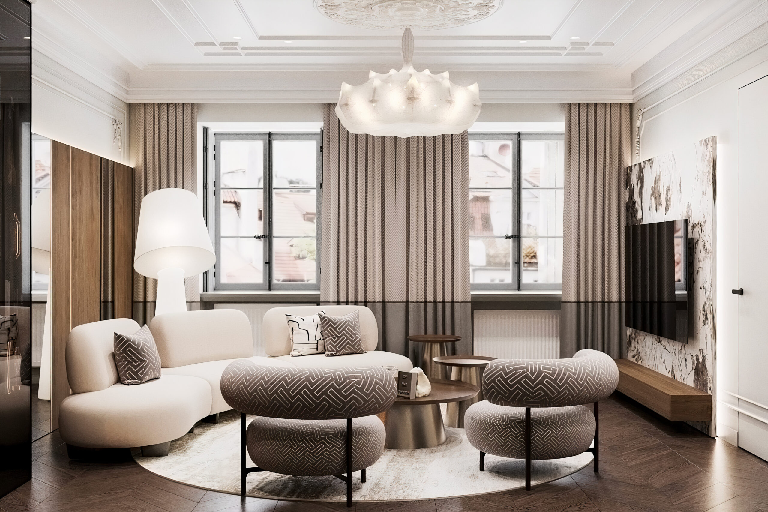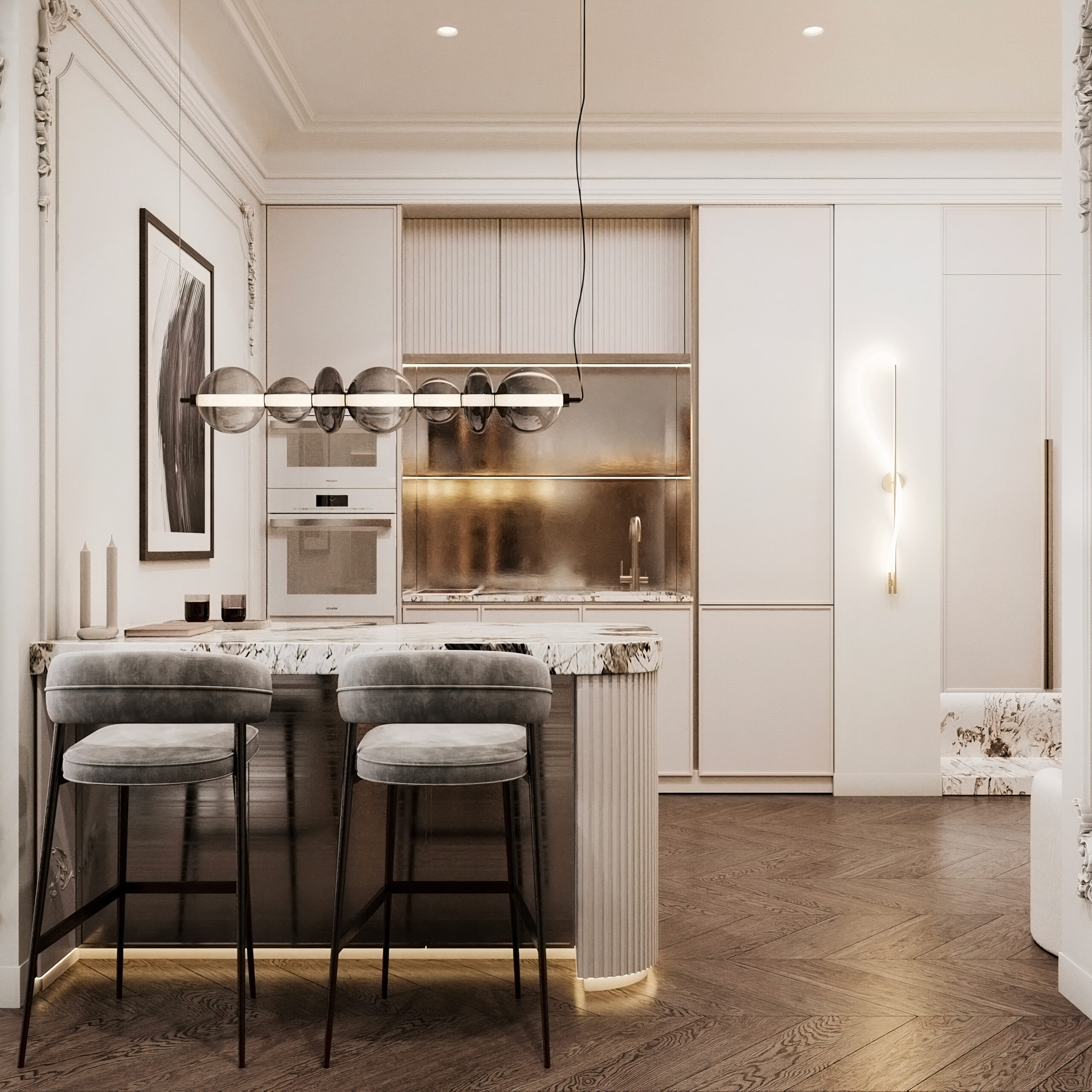 Mieszkanie w kamienicy w sercu Warszawy to połączenie ponadczasowej elegancji i nowoczesnych rozwiązań. Dominująca biel w zestawieniu z podłogą w klasyczną jodełkę w głębokim odcieniu brązu tworzy szykowne, a zarazem ciepłe wnętrze. Jasne drewno na okładzinach ściennych i dekoracyjna sztukateria ścienna oraz sufitowa podkreślają charakter miejsca. Przestrzeń wypełniają designerskie meble o nietypowych kształtach oraz ściana TV wykończona naturalnym kamieniem Patagonia, uzupełniona o czarne, eleganckie dodatki. Jasna kuchnia z frezowanymi frontami, zaobloną wyspą i lustrzanymi detalami wnosi lekkość i blask. W sypialni króluje głęboka szarość, przełamana ozdobną sztukaterią i szafą z ażurowymi frontami, które dodają wnętrzu subtelności. Odważnym akcentem mieszkania jest łazienka – zestawienie głębokiego fioletu na ścianach z kamieniem Patagonia i elementami szczotkowanego złota tworzy przestrzeń pełną wyrafinowania i wyjątkowego charakteru.