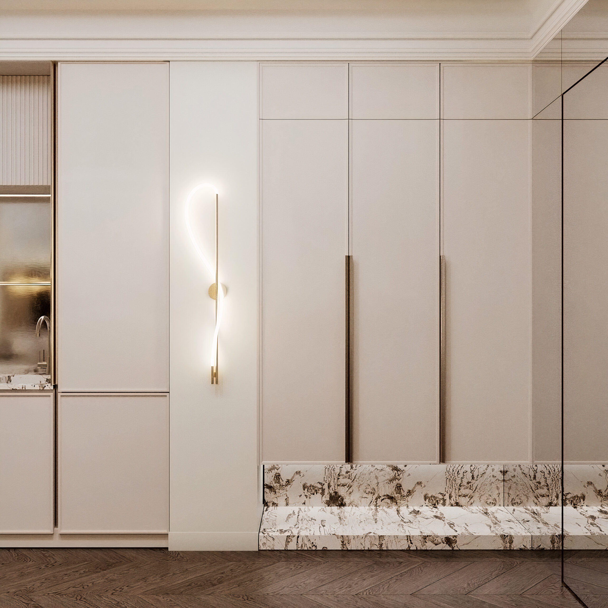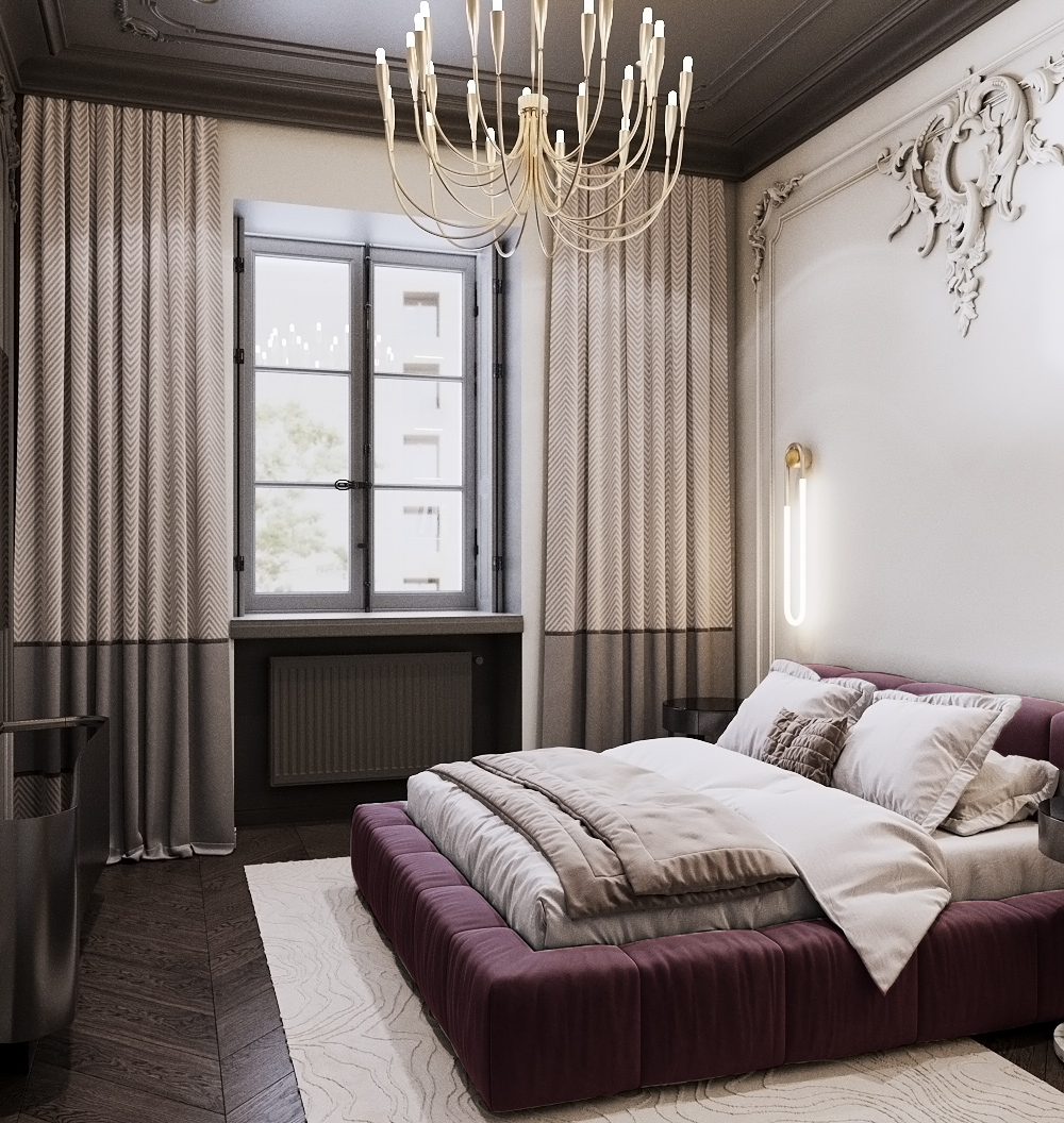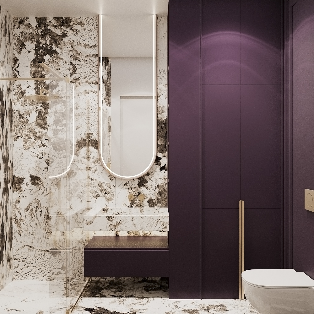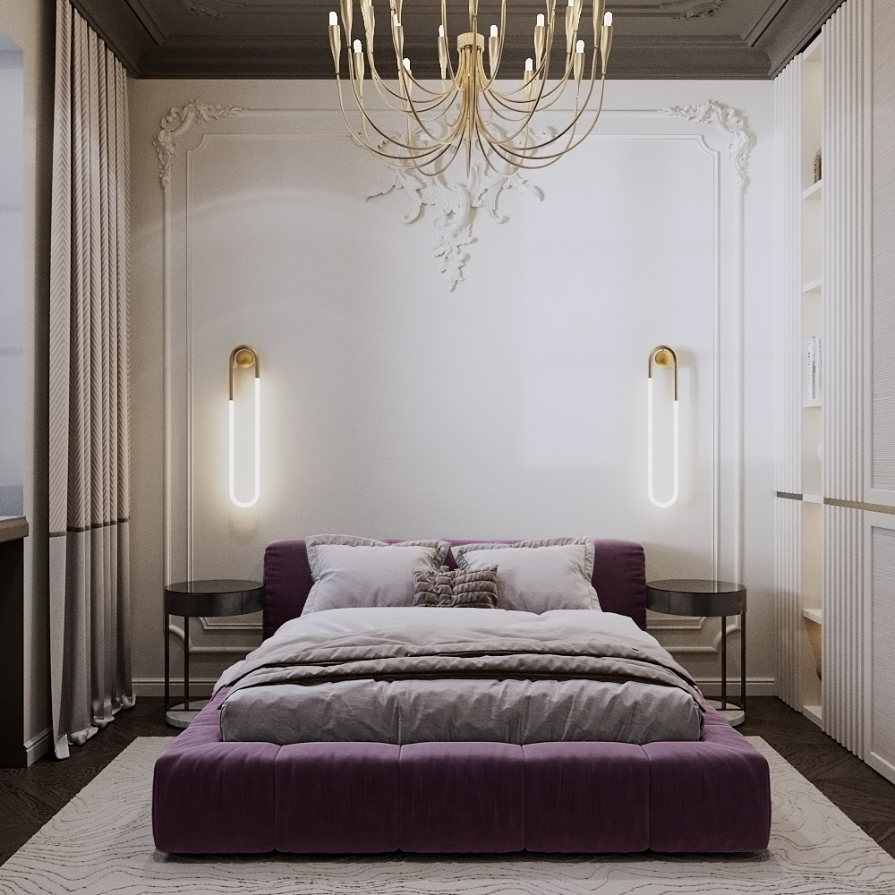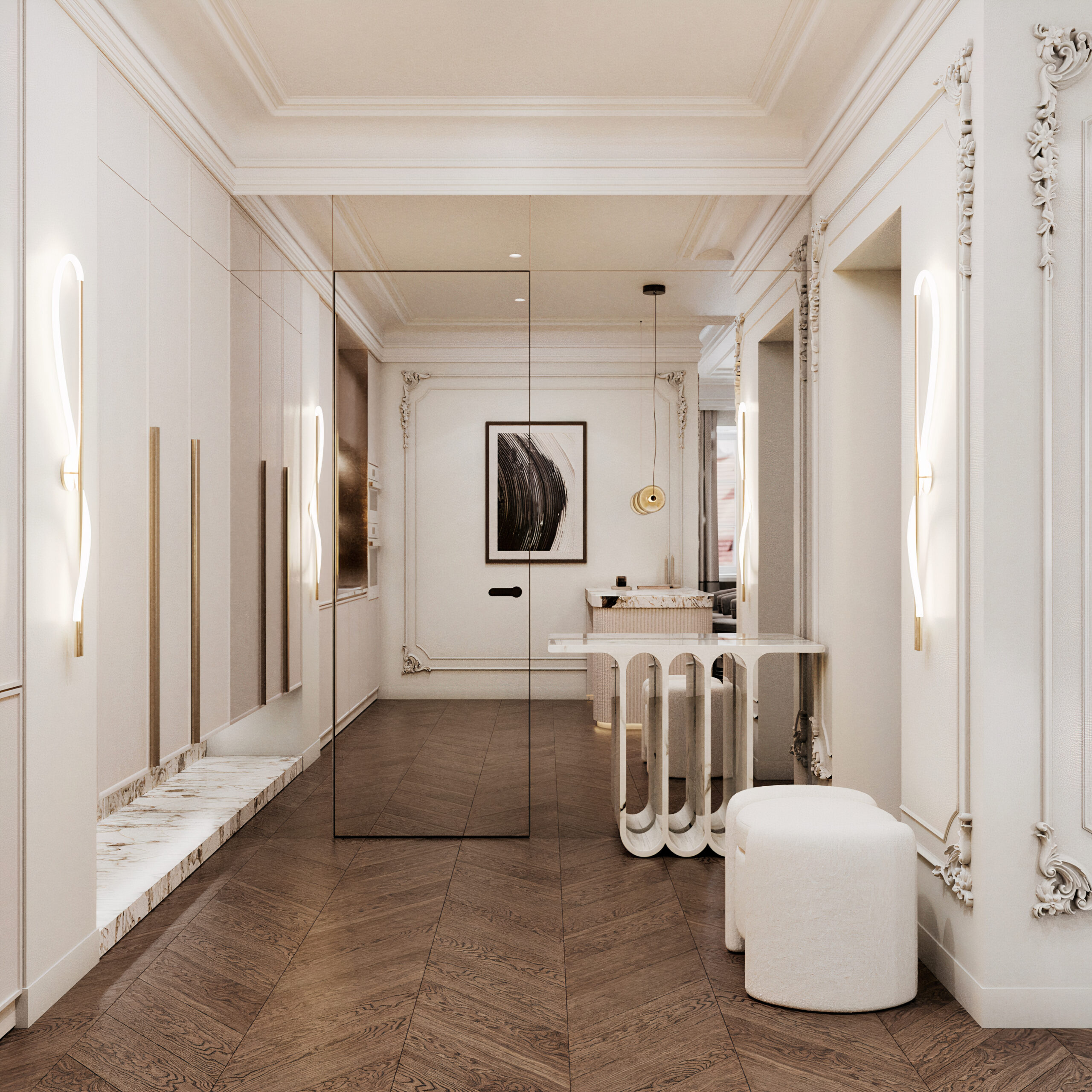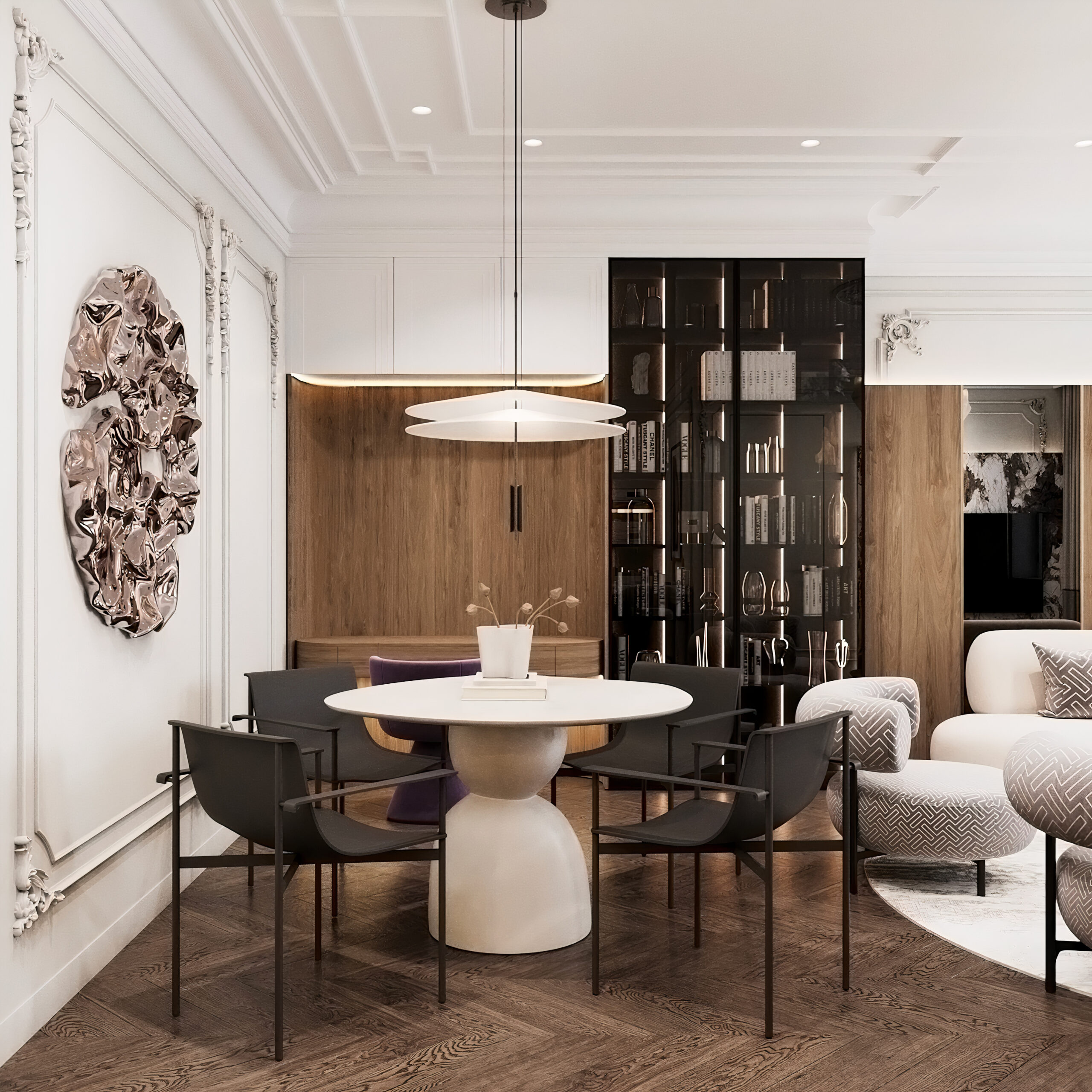 Mieszkanie w kamienicy w sercu Warszawy to połączenie ponadczasowej elegancji i nowoczesnych rozwiązań. Dominująca biel w zestawieniu z podłogą w klasyczną jodełkę w głębokim odcieniu brązu tworzy szykowne, a zarazem ciepłe wnętrze. Jasne drewno na okładzinach ściennych i dekoracyjna sztukateria ścienna oraz sufitowa podkreślają charakter miejsca. Przestrzeń wypełniają designerskie meble o nietypowych kształtach oraz ściana TV wykończona naturalnym kamieniem Patagonia, uzupełniona o czarne, eleganckie dodatki. Jasna kuchnia z frezowanymi frontami, zaobloną wyspą i lustrzanymi detalami wnosi lekkość i blask. W sypialni króluje głęboka szarość, przełamana ozdobną sztukaterią i szafą z ażurowymi frontami, które dodają wnętrzu subtelności. Odważnym akcentem mieszkania jest łazienka – zestawienie głębokiego fioletu na ścianach z kamieniem Patagonia i elementami szczotkowanego złota tworzy przestrzeń pełną wyrafinowania i wyjątkowego charakteru.