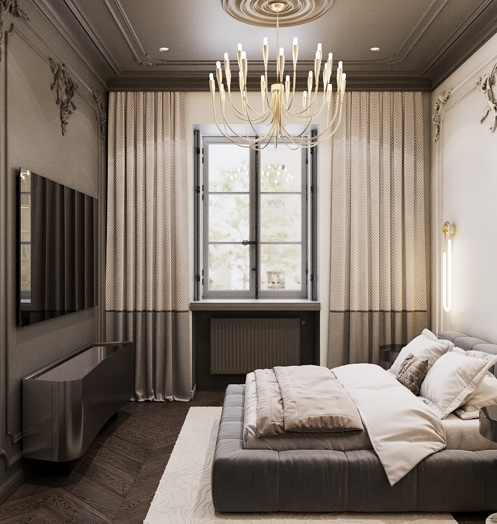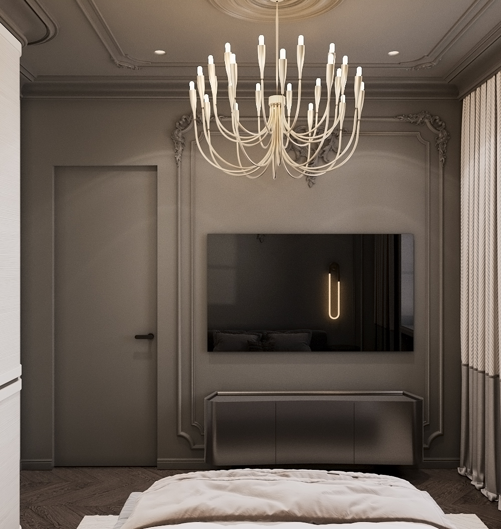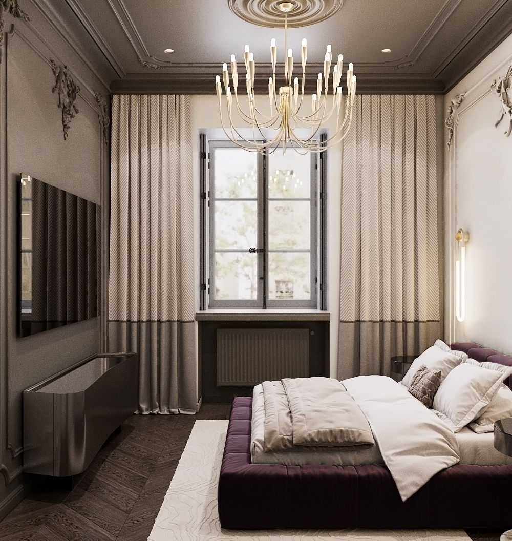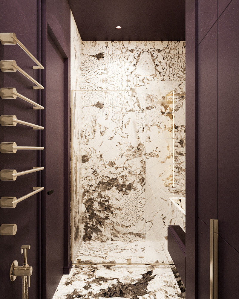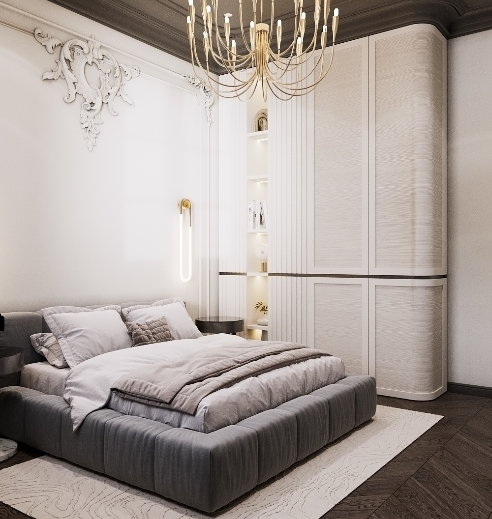 Mieszkanie w kamienicy w sercu Warszawy to połączenie ponadczasowej elegancji i nowoczesnych rozwiązań. Dominująca biel w zestawieniu z podłogą w klasyczną jodełkę w głębokim odcieniu brązu tworzy szykowne, a zarazem ciepłe wnętrze. Jasne drewno na okładzinach ściennych i dekoracyjna sztukateria ścienna oraz sufitowa podkreślają charakter miejsca. Przestrzeń wypełniają designerskie meble o nietypowych kształtach oraz ściana TV wykończona naturalnym kamieniem Patagonia, uzupełniona o czarne, eleganckie dodatki. Jasna kuchnia z frezowanymi frontami, zaobloną wyspą i lustrzanymi detalami wnosi lekkość i blask. W sypialni króluje głęboka szarość, przełamana ozdobną sztukaterią i szafą z ażurowymi frontami, które dodają wnętrzu subtelności. Odważnym akcentem mieszkania jest łazienka – zestawienie głębokiego fioletu na ścianach z kamieniem Patagonia i elementami szczotkowanego złota tworzy przestrzeń pełną wyrafinowania i wyjątkowego charakteru.